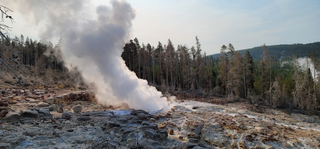 One of the interesting aspects of the thermal features in Yellowstone is how they sound. Many people see pictures of the sites or can imagine the sulfur smell. But we hadn’t anticipated the gurgling, blub-blub-ing, splashing and hissing. We put some short videos at the bottom of the post with some of the sounds if you want to hear it.