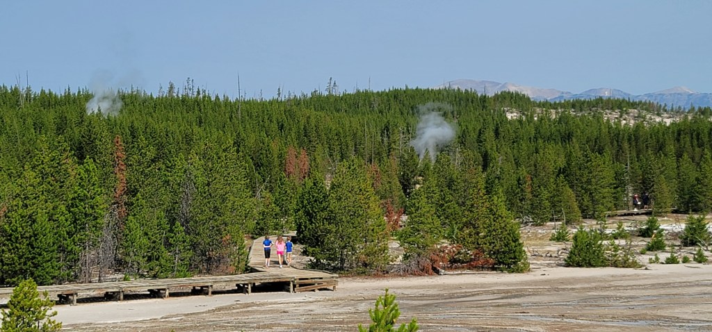 Our first stop was at the Norris Geyser Basin which produces some of the oldest and hottest springs in the Park. Steamboat Geyser shoots spray up to 300 feet into the air and had a significant eruption just 8 days ago.