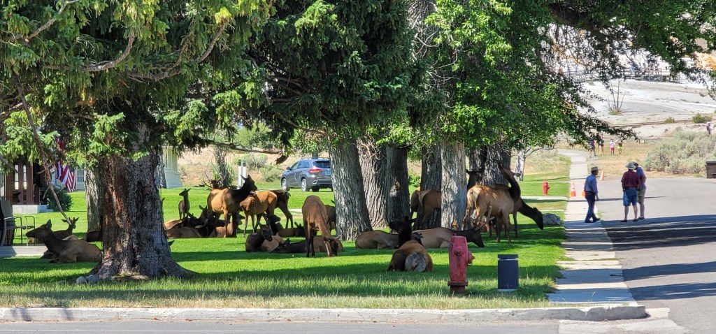 We had a couple great wildlife encounters as we left the park. The first was a herd of elk hanging out in the shade at Fort Yellowstone.