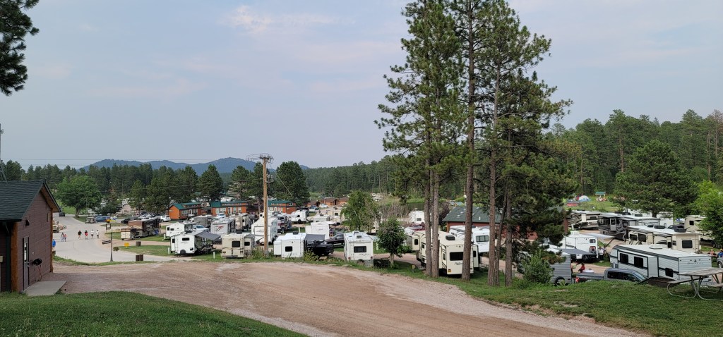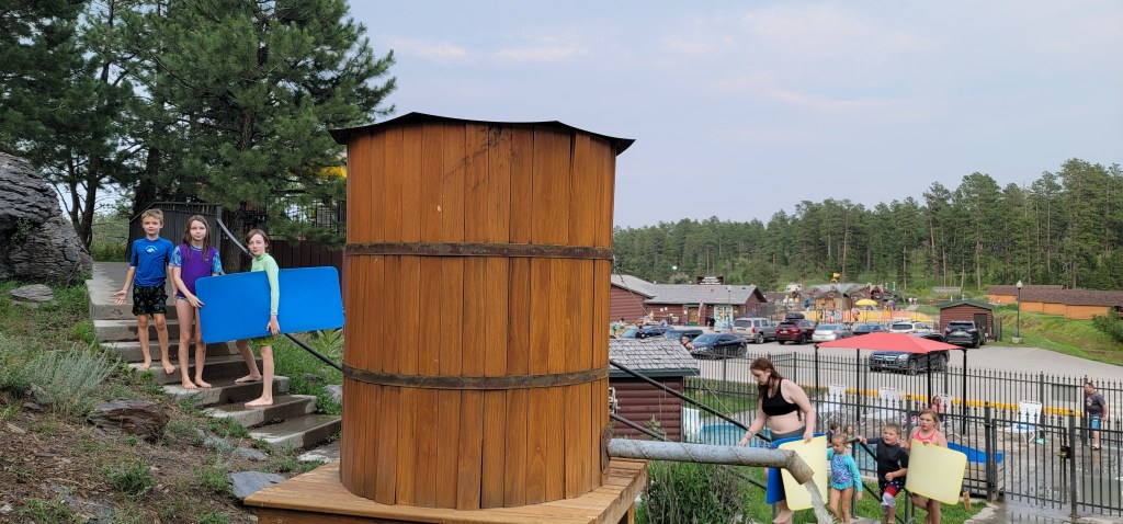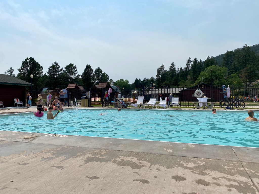 Behold the Fun Zone at the KOA Palmer Gulch campground. At first glance it looks a like just a normal pool, but if you zoom in behind the pool on the left, you’ll see in succession a giant chess set, a playground, an inflatable giant pillow for jumping and a splash pad. In the middle is a canteen store tucked behind the basketball court and on the right are bike rentals. Just out of the picture on the right are corn hole boards, an extra inflatable jumpy (since it’s Tuesday) and a bingo game taking place at the activity pavilion (started at 2pm). Behind the store is a mini-golf course, a water slide and a place to pan gold. So yeah – it’s a lot of options. I think the kids’ heads exploded just a little bit.