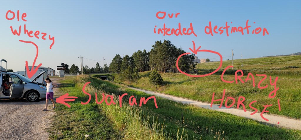 Sadly, there were no improvements for the rest of the afternoon. Ole Wheezy needed two “please stop I’m overheating’ rests to get 15 miles to the auto parts store and two more stops to get back to camp. We didn’t quite make it to the Crazy Horse statue like we’d planned – the roadside parking lot before the entrance may be as close as we get.