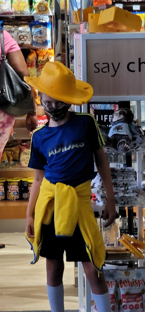 We left Wisconsin today for an overnight stop in Atlanta before going to Central America on Friday. We arrived at the airport in time to try on the latest in Cheesehead fashion.