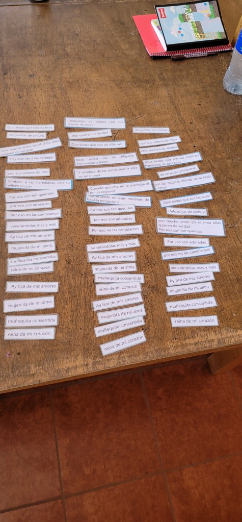 The teacher also played a folk song called Ticas Lindos which goes at a pretty fast clip. We thought it was a nice pleasant song as we listened, then she said there was an activity! She laid laminated sections of all the lyrics (in español por supuesto) in a jumble on the table and we had to put them in order while we listened to the song. It was hard at first and then easier, especially as the chorus repeats. After we were done we all joined in together to sing the song as best we could. It was fun and gave us a better understanding of people who say they learned to speak English from watching movies.
