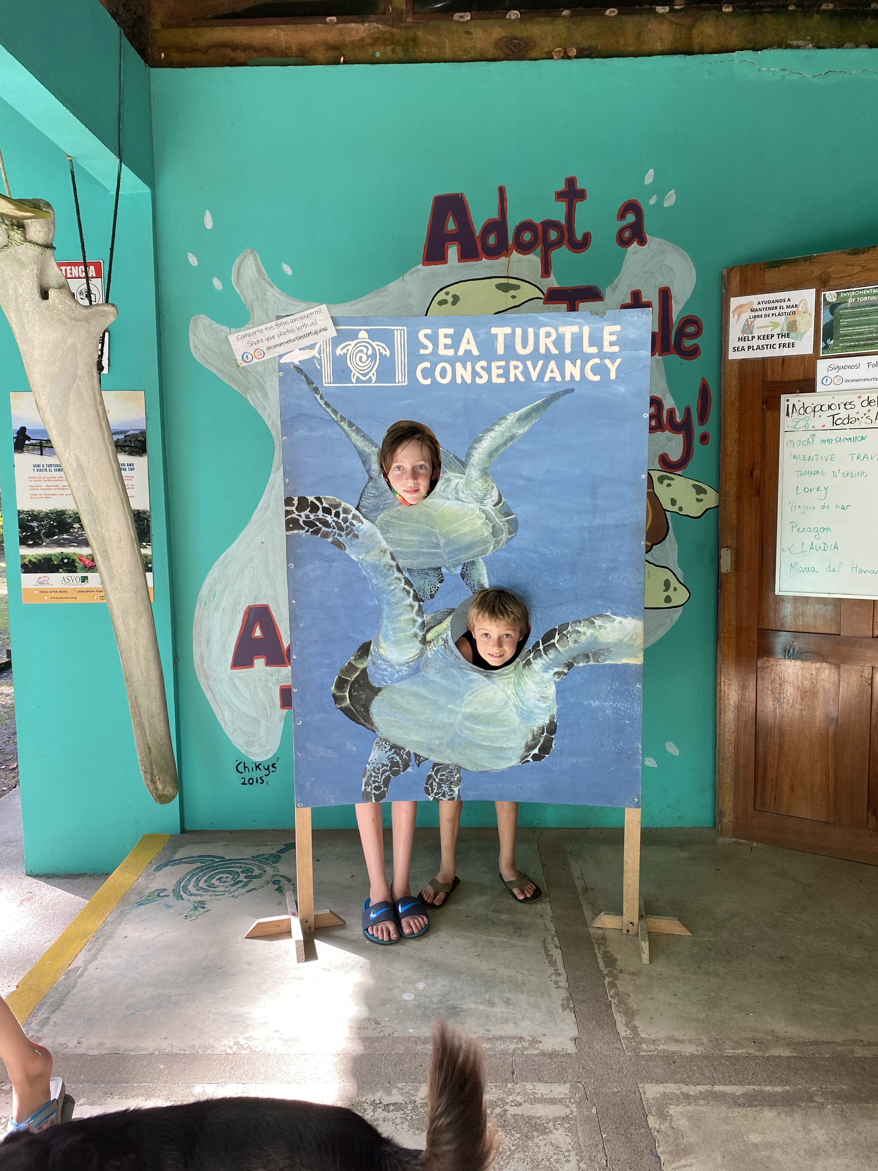 Our only real outing of the day was a small museum hosted by the Sea Turtle Conservancy. It highlights the conservation work they do and how Tortuguero has been a leader in approaches to help endangered sea turtles which are copied around the world. They also had a model of a nesting green turtle laying eggs. It was very similar to the one we saw last night so CreeperPuppy got to recreate how he helped pull the turtle’s fin back during the egg laying – this time while smiling for the camera.