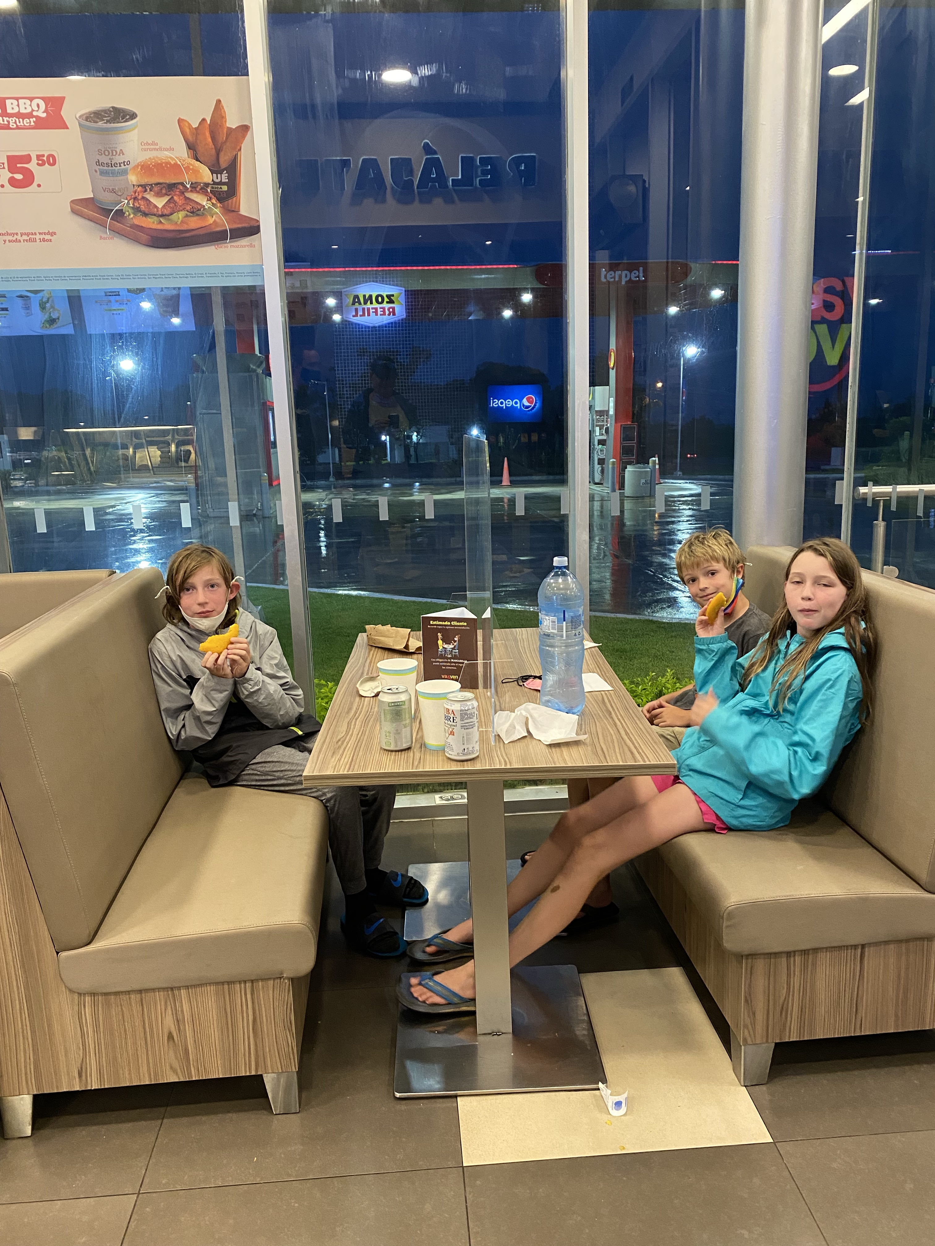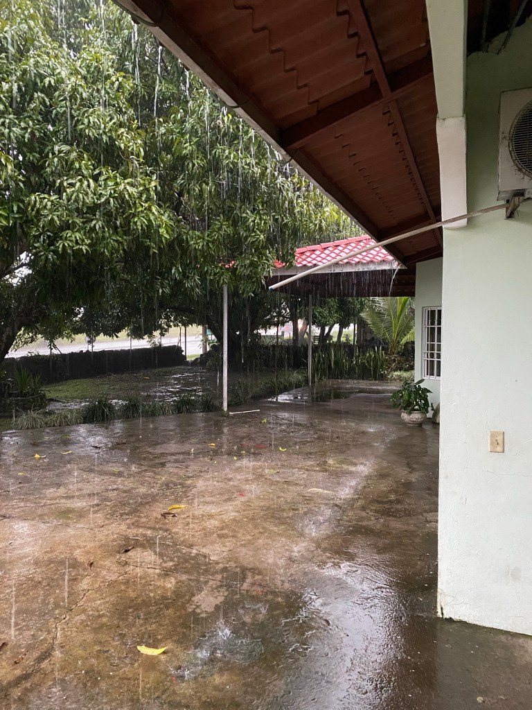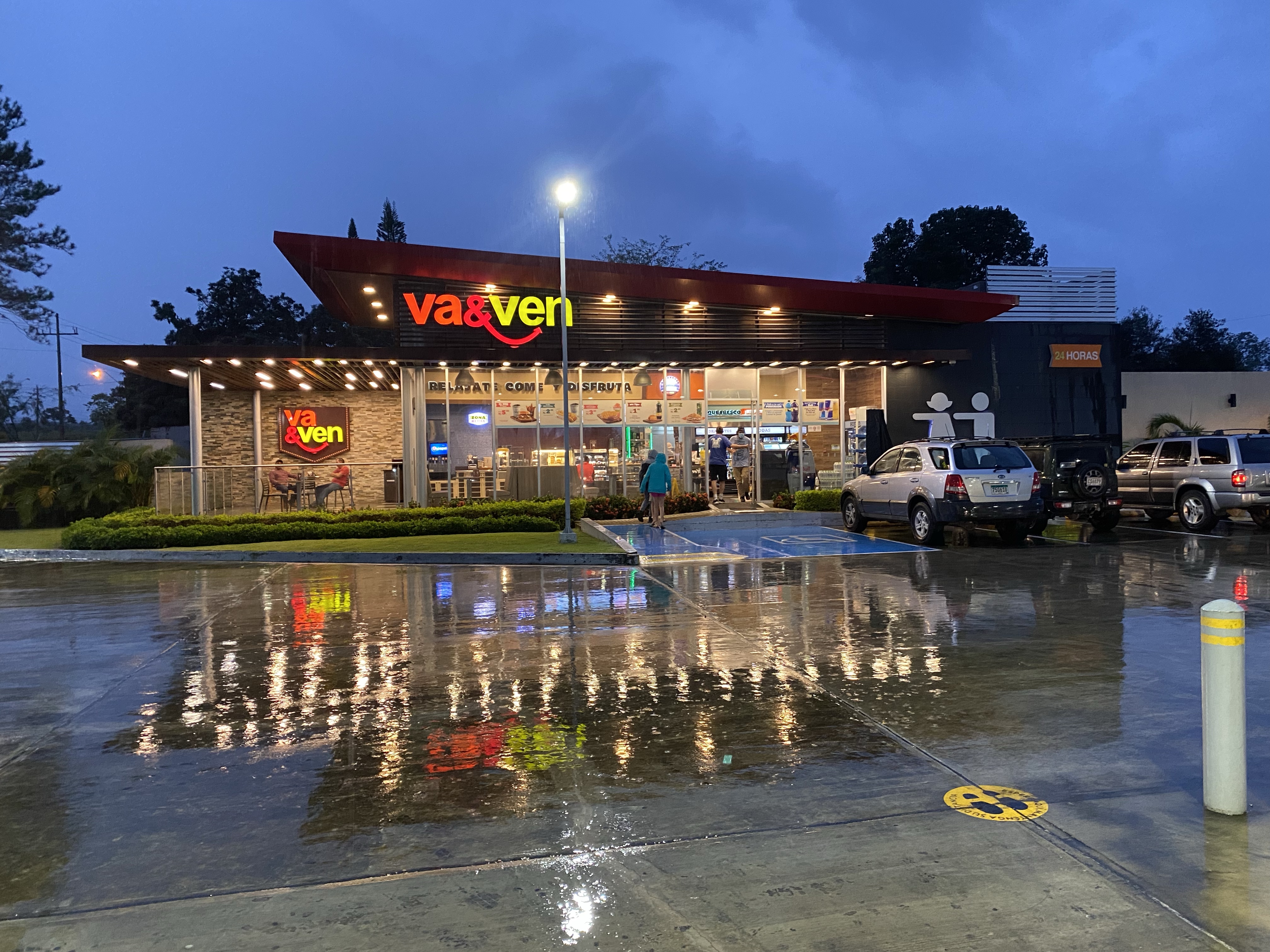With no car, torrential rain and the closest restaurant 1 mile and grocery 4 miles away, we decided dinner would be a new adventure – the Va&Ven at the gas station 40 yds up the road. Va&Ven is Panama’s 24 hour come and go convenience store chain at certain gas stations. In addition to snacks, it has fast food to order like hamburgers, hot dogs, chicken fingers and some pretty tasty empanadas. We were hoping to get dinner and some basics like milk and eggs to tide us over for tomorrow morning. We did get dinner but they don’t sell eggs or milk like a big convenience store in the US. Perhaps that’s because in the morning instead of hamburgers, the kitchen will serve you breakfast.