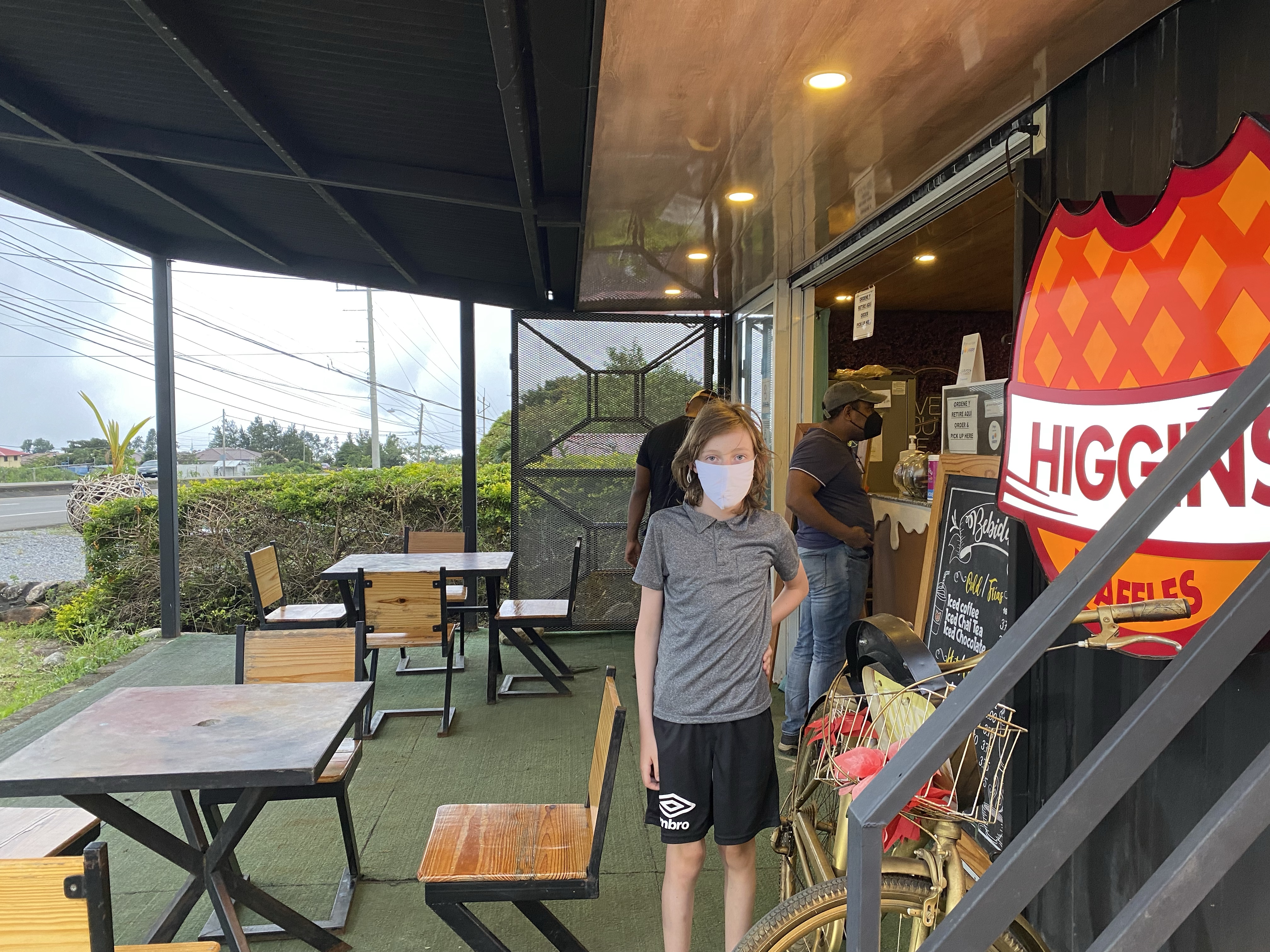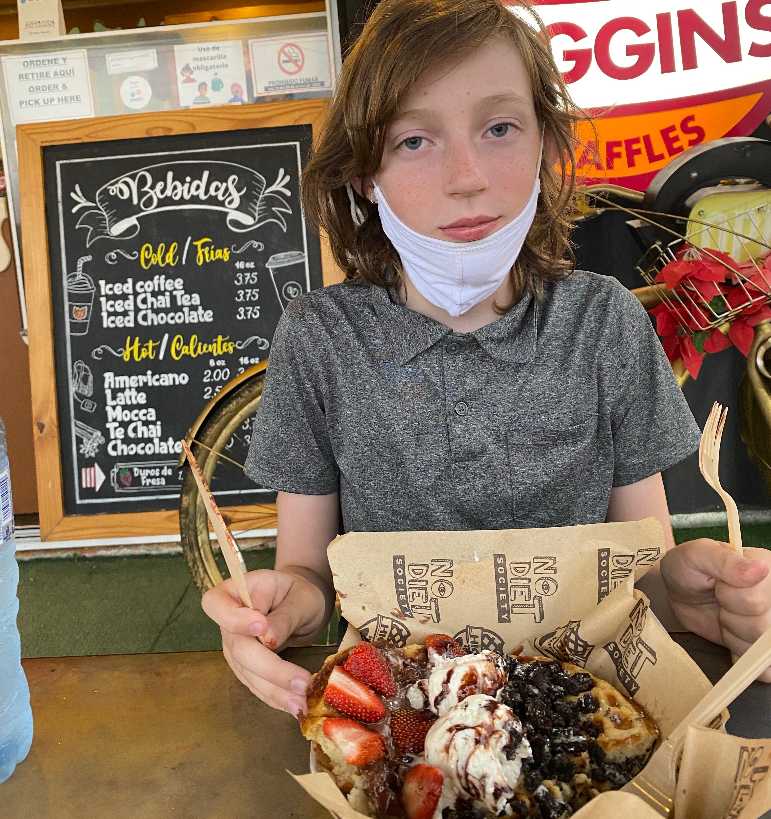 After a quick stop at the Supermarket they drove through a short but intense rainstorm (road flooded, hazards on) to their next destination- treats! CreeperKitty has been asking for Belgian waffles with ice cream and boy did this roadside stand deliver. Waffle, vanilla ice cream, Nutella, crumbled Oreos and fresh strawberries. The next downpour of rain held off just long enough for them to finish and jump back in the car.