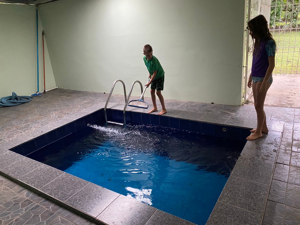 Today was a lazy Sunday here in Boquete. The sun was shining brightly this morning but we spent time inside doing some online adventures. The kids FINALLY convinced Mom and Dad to join them in a Minecraft world. It was hosted by Suaram and titled ‘Suckers’ which seems pretty appropriate. Tiffany started building a house next to CreeperPuppy’s restaurant and Suaram’s enchanted bookstore. Brian had some technical difficulties and just managed to get to the growing village before we called it quits for the day.