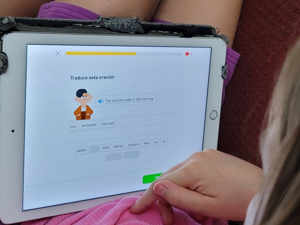 The parents haven’t determined whether we should consider this activity inventive or cheating. The truth is that after watching over their shoulders and seeing them needing to interpret the Spanish instructions prior to answering, we pretty much just shrug our shoulders, scratch our heads and wonder “why”?