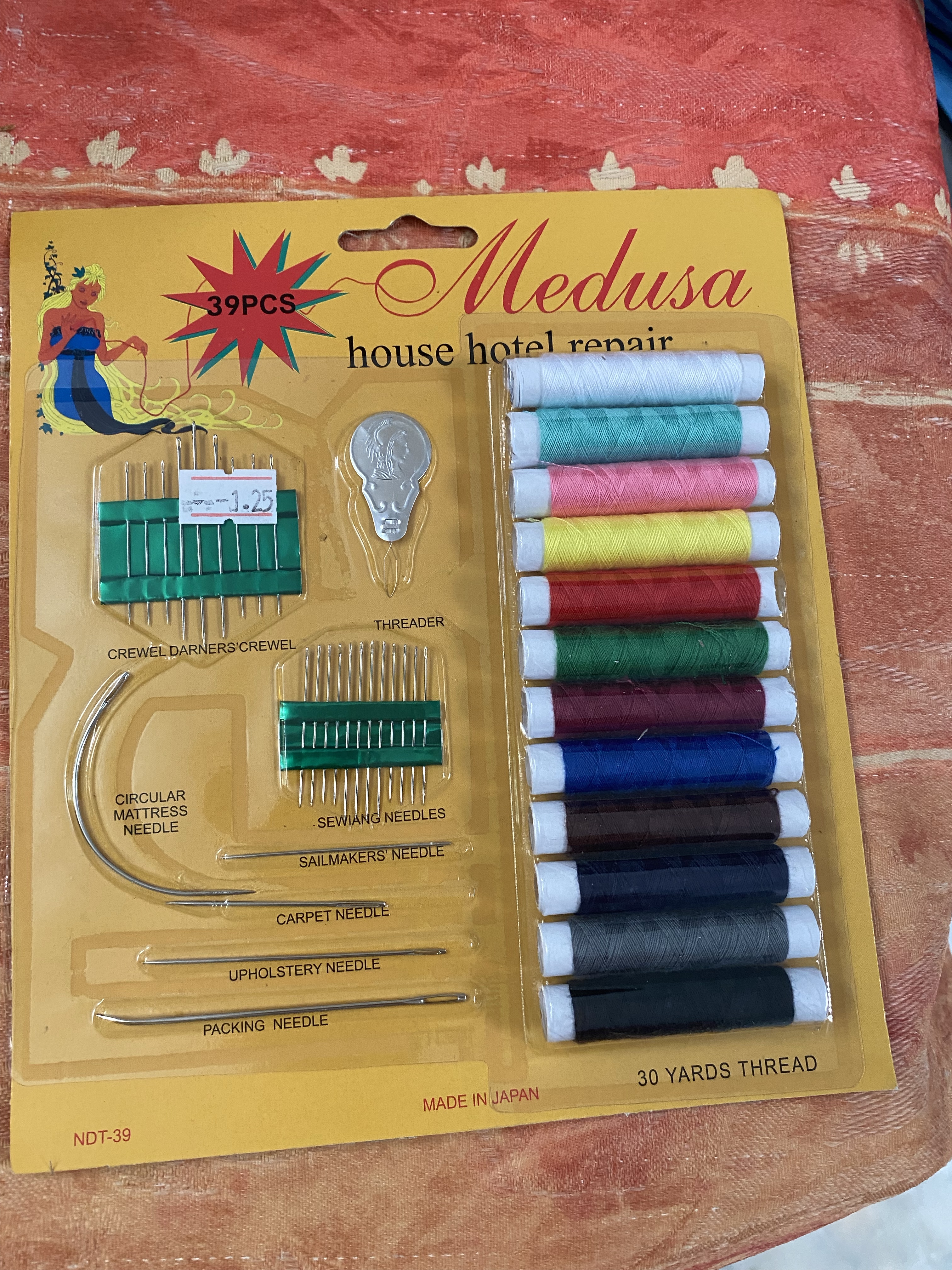 Turns out the store had a couple of options, and she brought home a Medusa house hotel repair kit imported from Japan. While the pink wasn’t quite as hot as Coral’s it was pretty close and at $1.25, the kit seemed a good deal. It even comes with a circular mattress needle and a packing needle – neither of which Tiffany even knows when to use.