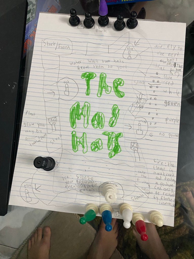 Coral got her repair and seemed pretty pleased. The evening ended with the kids playing a new board game Suaram created yesterday called The Mad Hats. Mom played for a while and it’s pretty fun. It’s played with chess pawns and the pieces from other games and a board Suaram designed herself. Maybe we can get her to describe the gameplay in a future post.