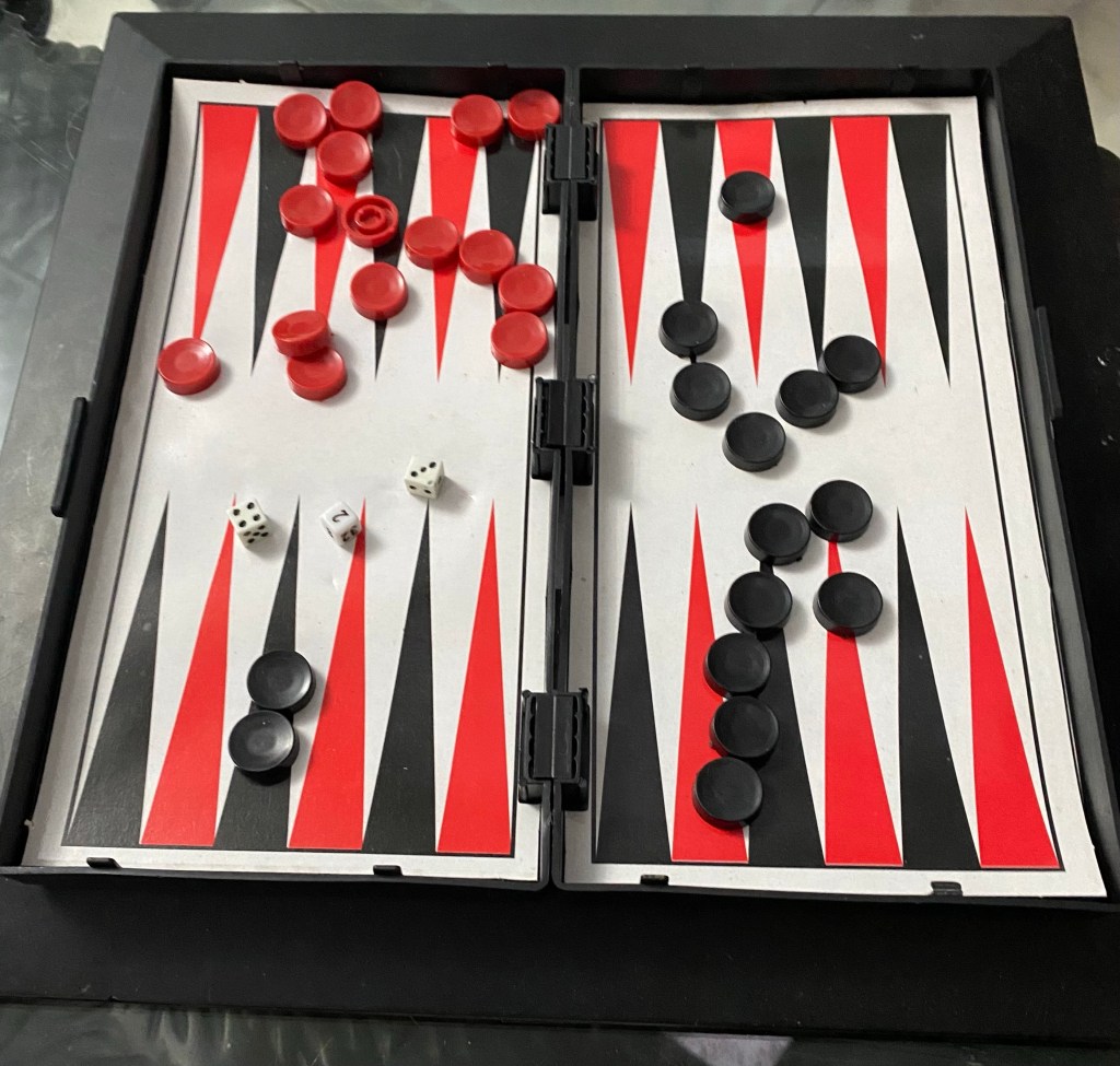 While the kids played math games at the end of school, the teachers moved to the ‘lounge’ aka the living room and struck up a game of backgammon. If you recall back on Day 16 we got a travel combo set of chess/checkers/backgammon and as is typical the pieces are quite small.