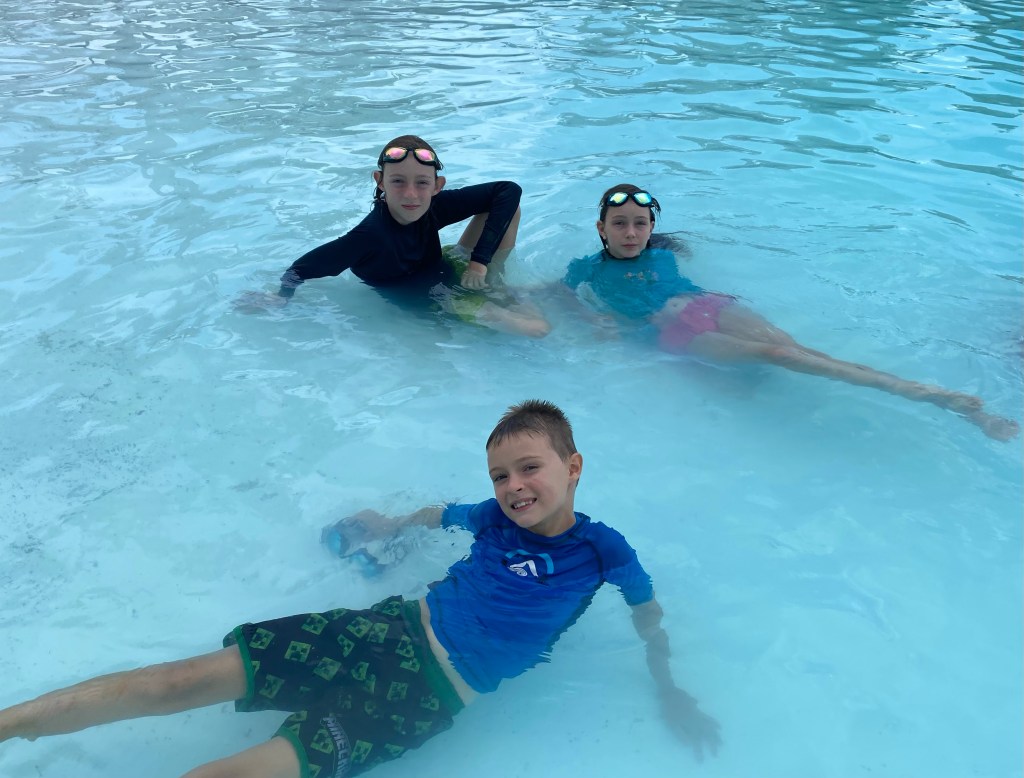 This was a kids’ choice day for our adventures and they chose to start at the lagoon pool and waterslides. Even Mom and Dad took a turn and Mom forgot she had her reading glasses on her head coming down the slide. They went flying but CreeperKitty recovered them unharmed.