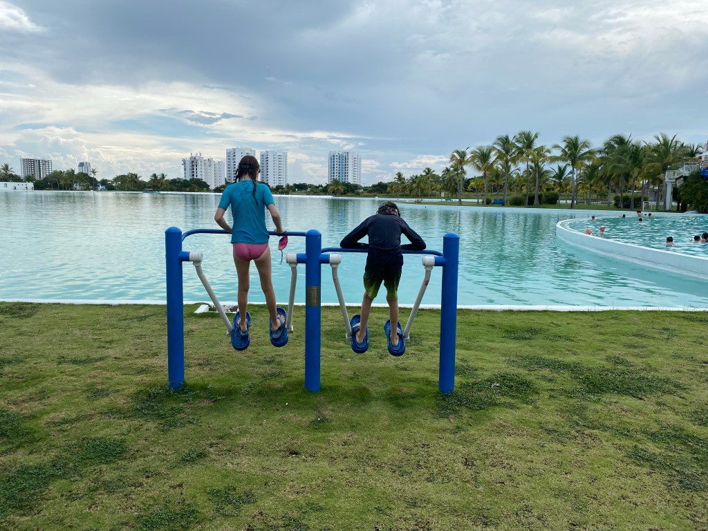 Between the over-large lagoon and the Pacific Ocean, there are plenty of other distractions to enjoy. Here the kids chose to spend some time on the exercise equipment.