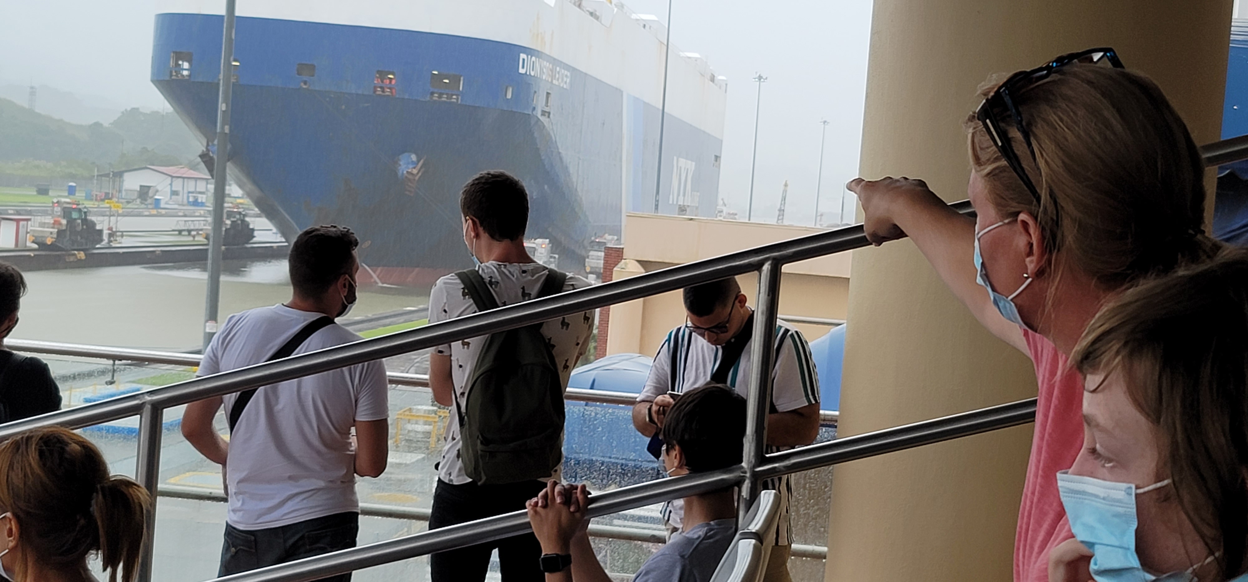 It was the vehicle carrier Dionysus Leader, flying under the flag of Japan. Ships of this type can carry up to 8,500 cars. It’s width is the maximum the old locks can hold. We also saw a large container ship approach the new locks further away. As school field trips go, this was a good one.