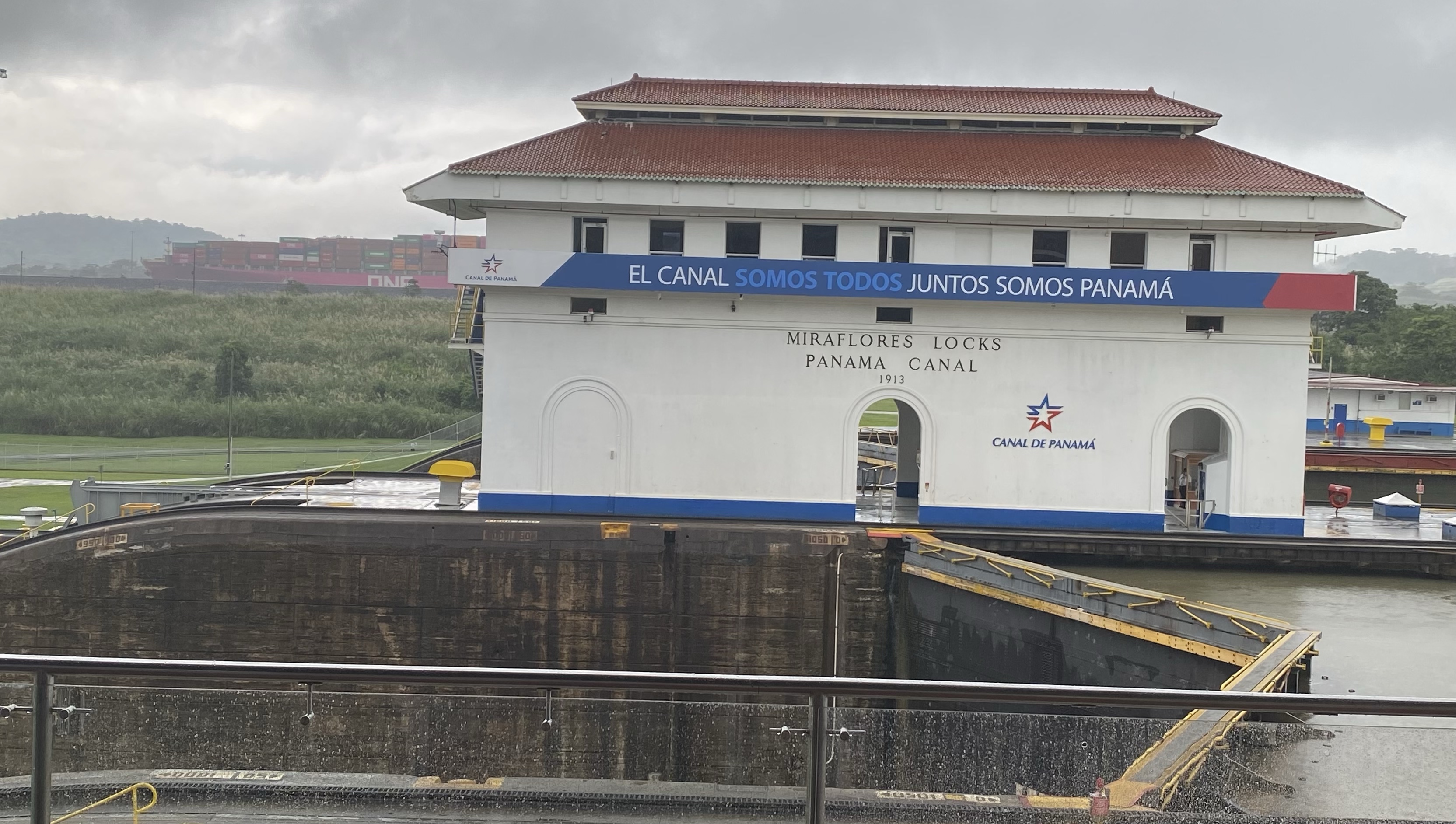 Then it was outside for the real show – the locks themselves. After a few minutes at the viewing deck we starting to see some activity. One of the tugs was moving through the locks headed away from the Pacific toward Miraflores lake. We got to see the lock doors close, the water come up and see the boat move into the lake. It was good the boat was small so we could see the water moving in the lock, but it was missing a bit of the wow factor.