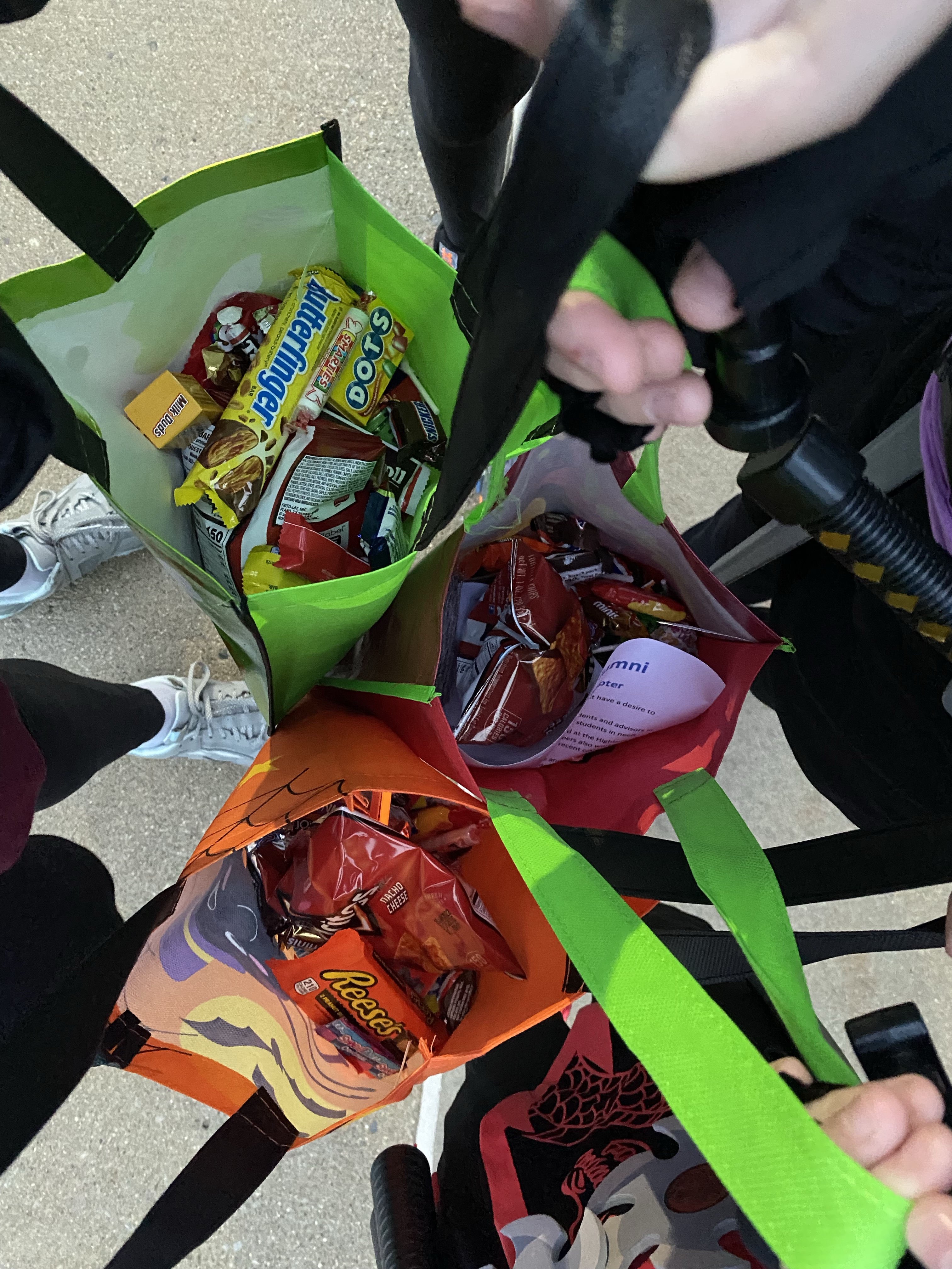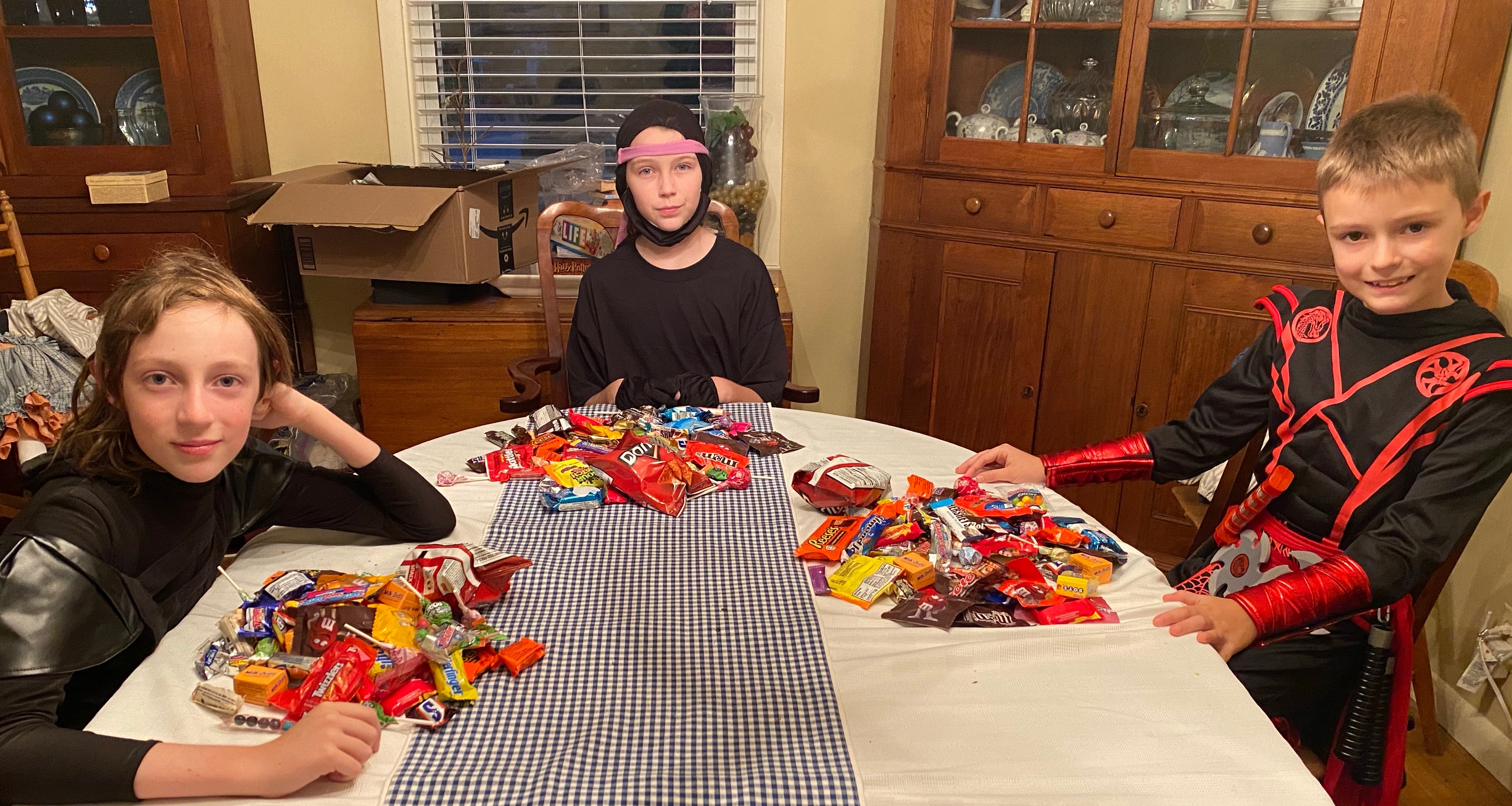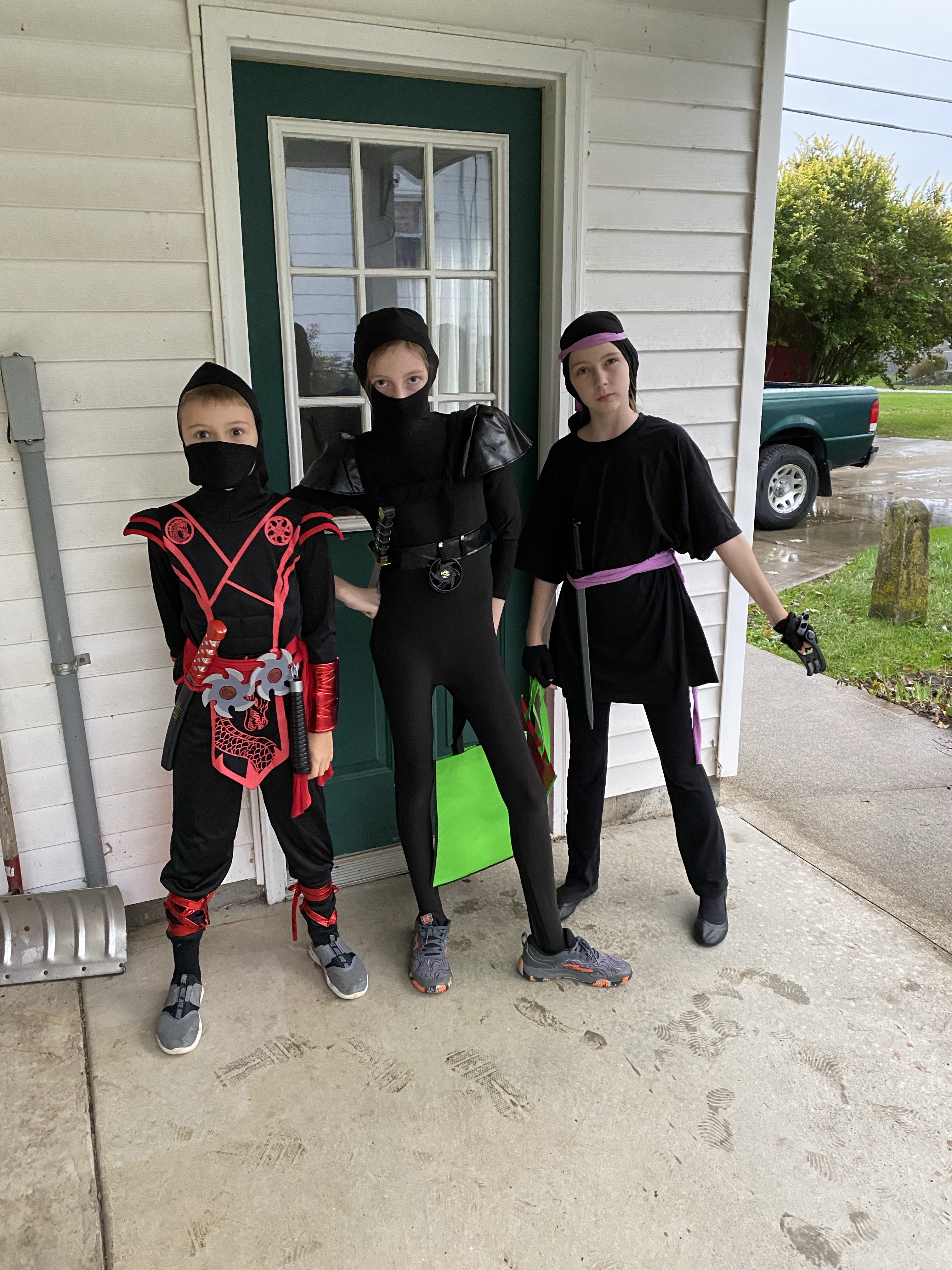 All three kids decided to be ninjas this year but due to a scheduling mix up Suaram’s fancy costume won’t arrive until tomorrow. No worries – we DIY’ed one, the boys loaned her some weapons and off we went. It was raining outside so we headed to the high school where the local businesses and school groups were handing out treats (no tricks to be found).