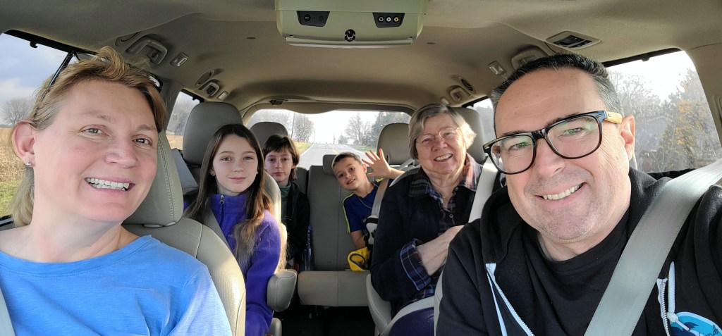 Total time from initial departure to final arrival is scheduled for 33 hours. We left Leesburg five hours before our flight (90 minute drive, lunch, early checkin) so we suspect when we add on immigration and other activities when we land, we’ll clock in at over 40 hours door to door. You can see below how fresh and energetic we all are as we start out from Leesburg with Mamoh along to drop us off and drive the van back to storage. Thanks Mamoh! Time will tell how these travelers look by Wednesday.