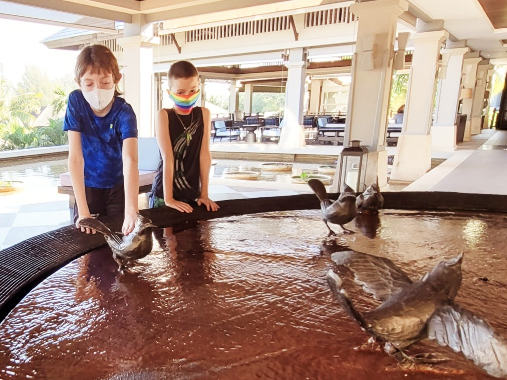 The parents are hoping their backpacks arrive in Thailand before too much baht gets spent on bathing/beachwear clothes.