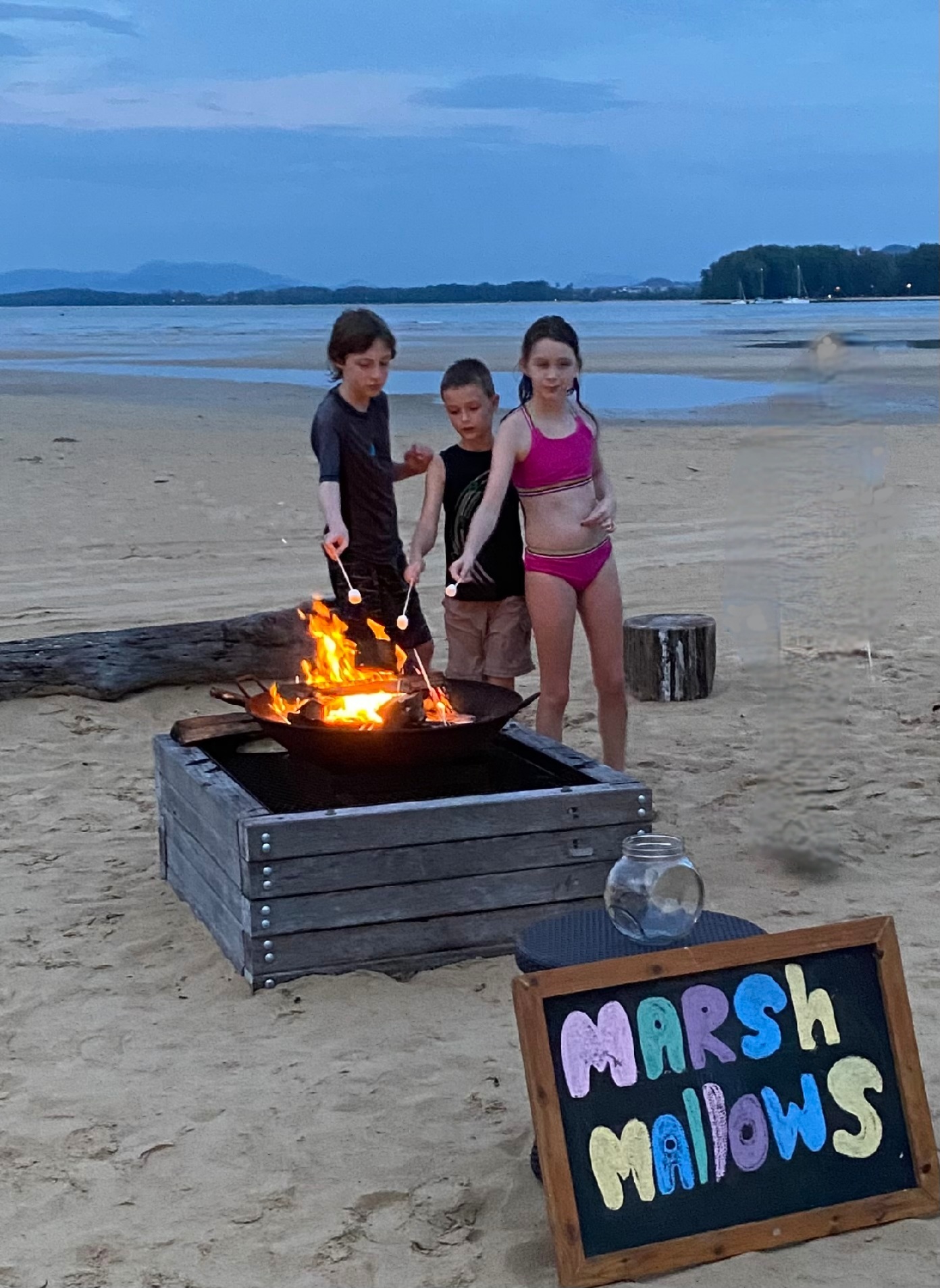By 6 the sun was setting which made the northwest facing beach look perfect for an evening dip and stroll. CreeperKitty kicked the soccer ball a bit with the rec attendant, we saw a bit of rainbow sneaking through the clouds, Suaram relaxed in the hammock and the kids finished the day with a marshmallow roasted over the fire.