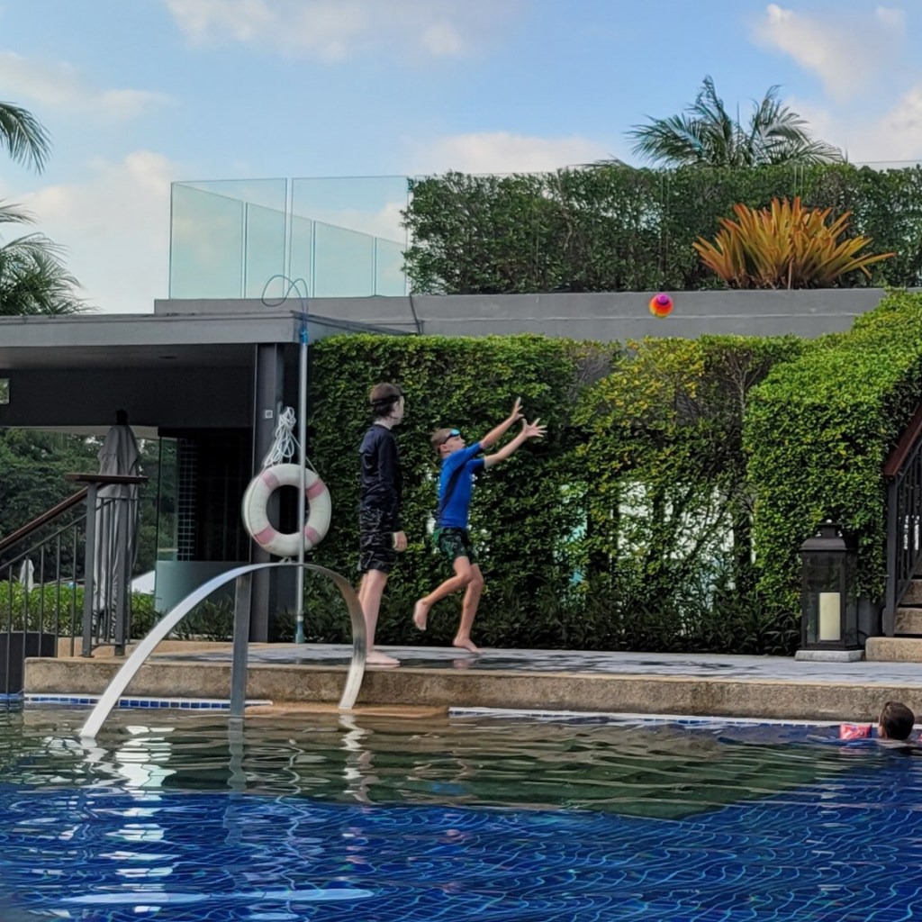 A few days ago CreeperKitty bought a toy football at the gift shop with his own money and we have been having a lot of fun playing with it on the beach and in the pool.