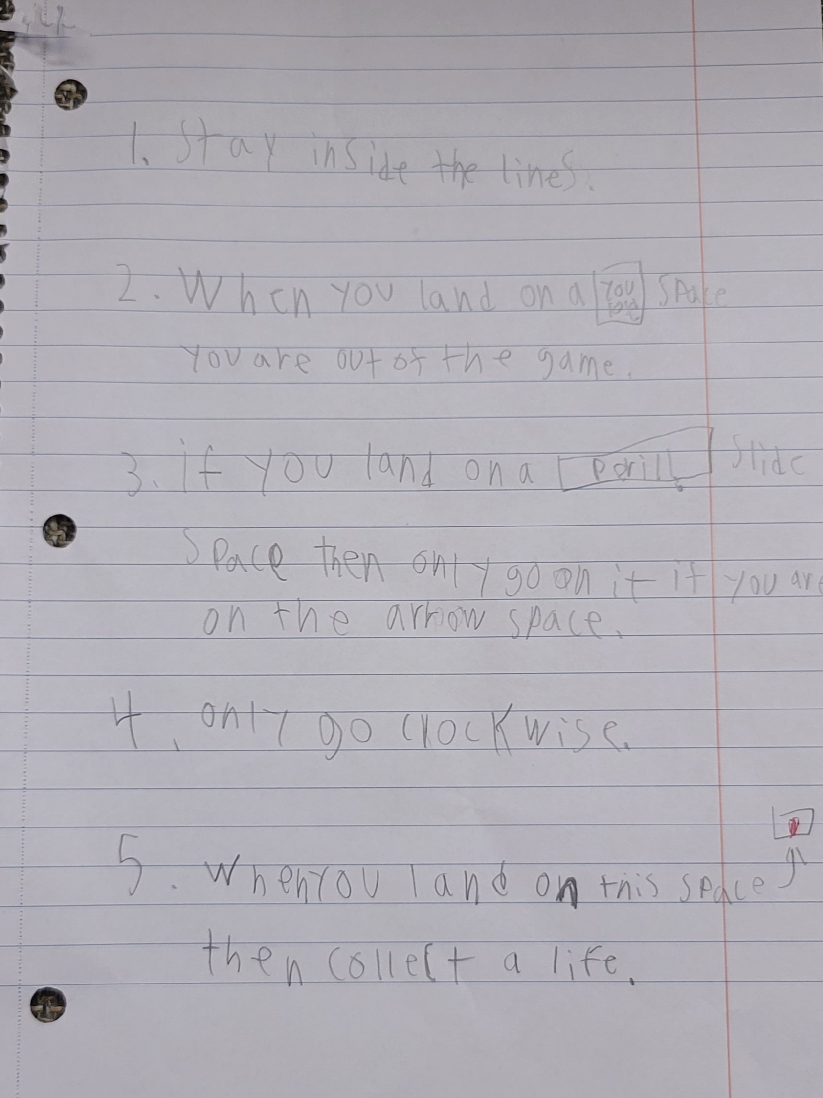 They were given 25 minutes to create a new game of their own invention. They needed to write down at least 5 rules for their game and then prepare a 5 minute presentation teaching everyone how to play it.