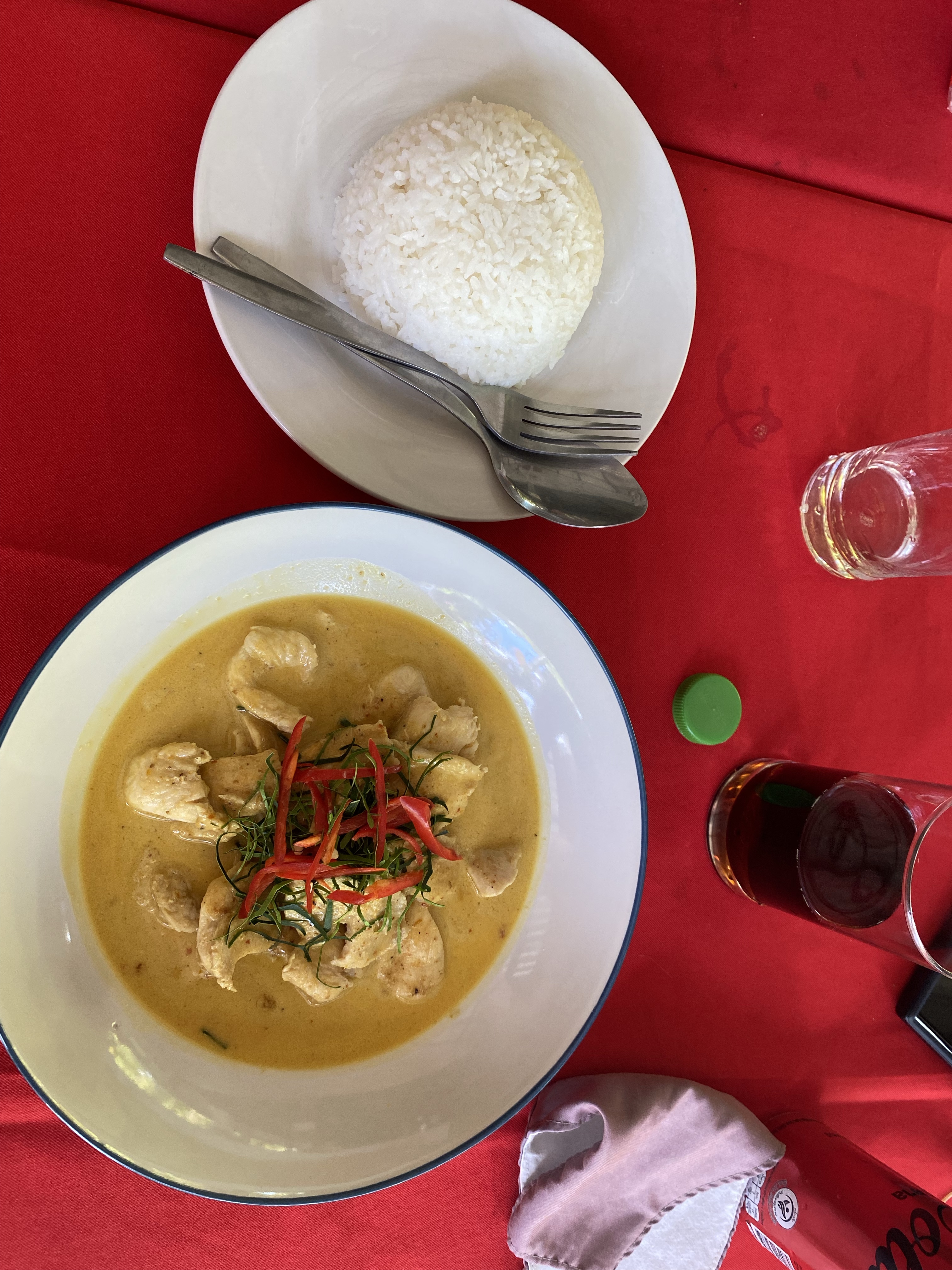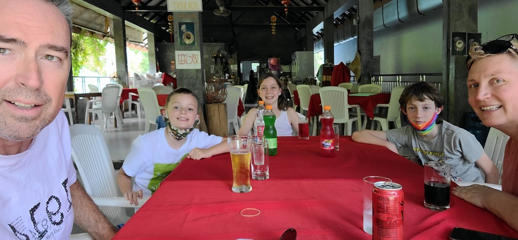 For lunch we walked out the front drive of the property and about 1/4 mile up the road. Our destination was a little place called Weena Restaurant. It had good reviews and an extensive menu – mostly Thai but plenty of western choices for the kids who are still mostly choosing to eat what’s familiar. They have been happy to find their favorite colored sodas in Thailand. Suaram in particular likes the red soda and often leaves meals with a mustache and dyed tongue.