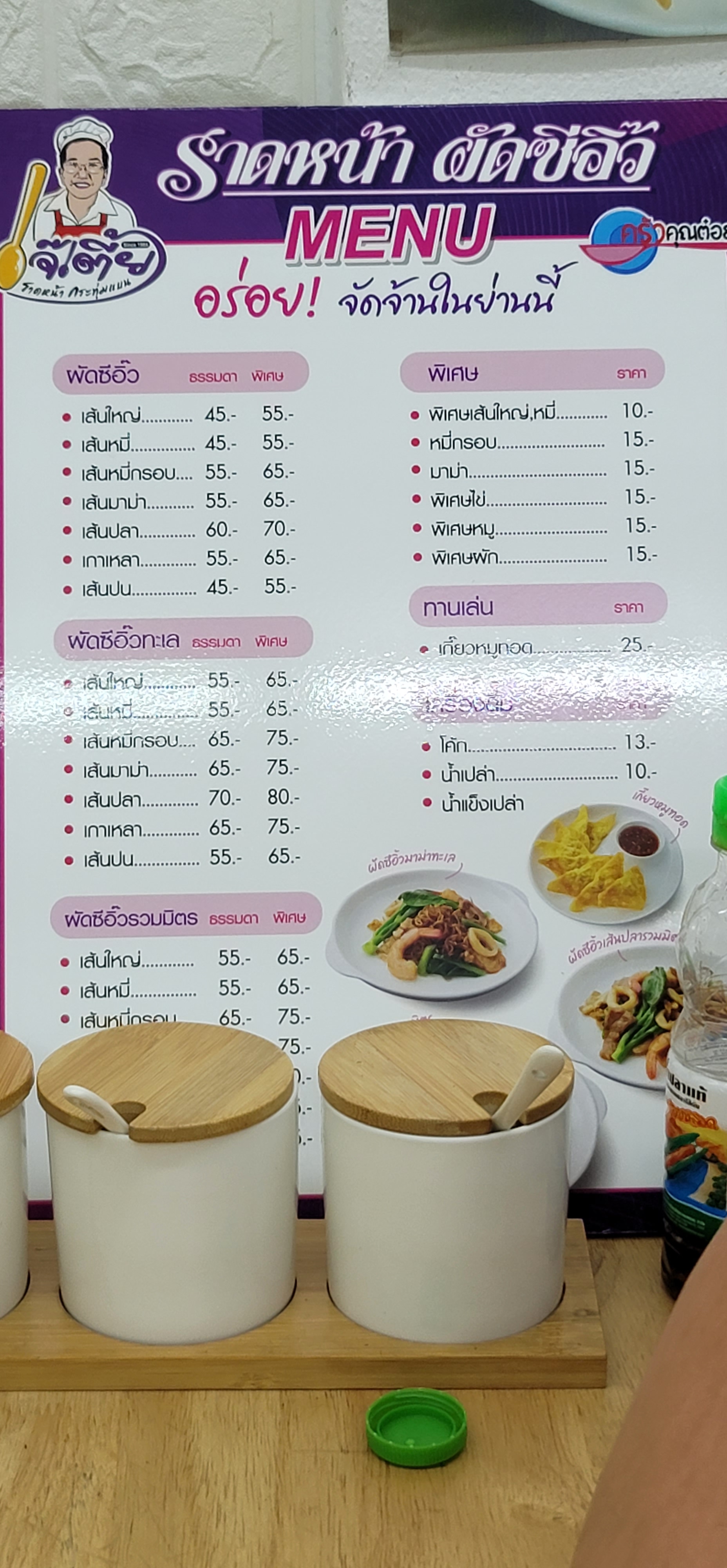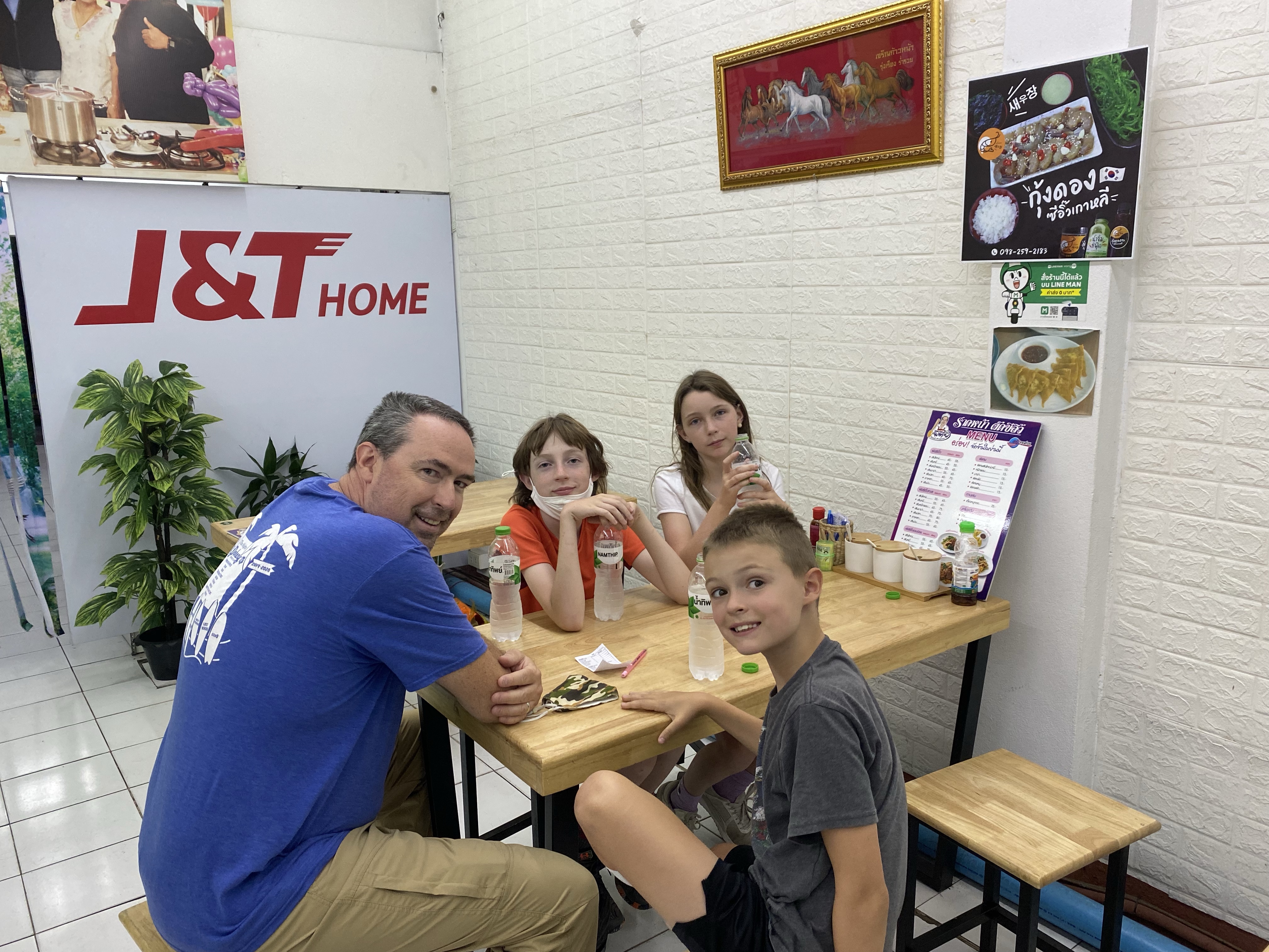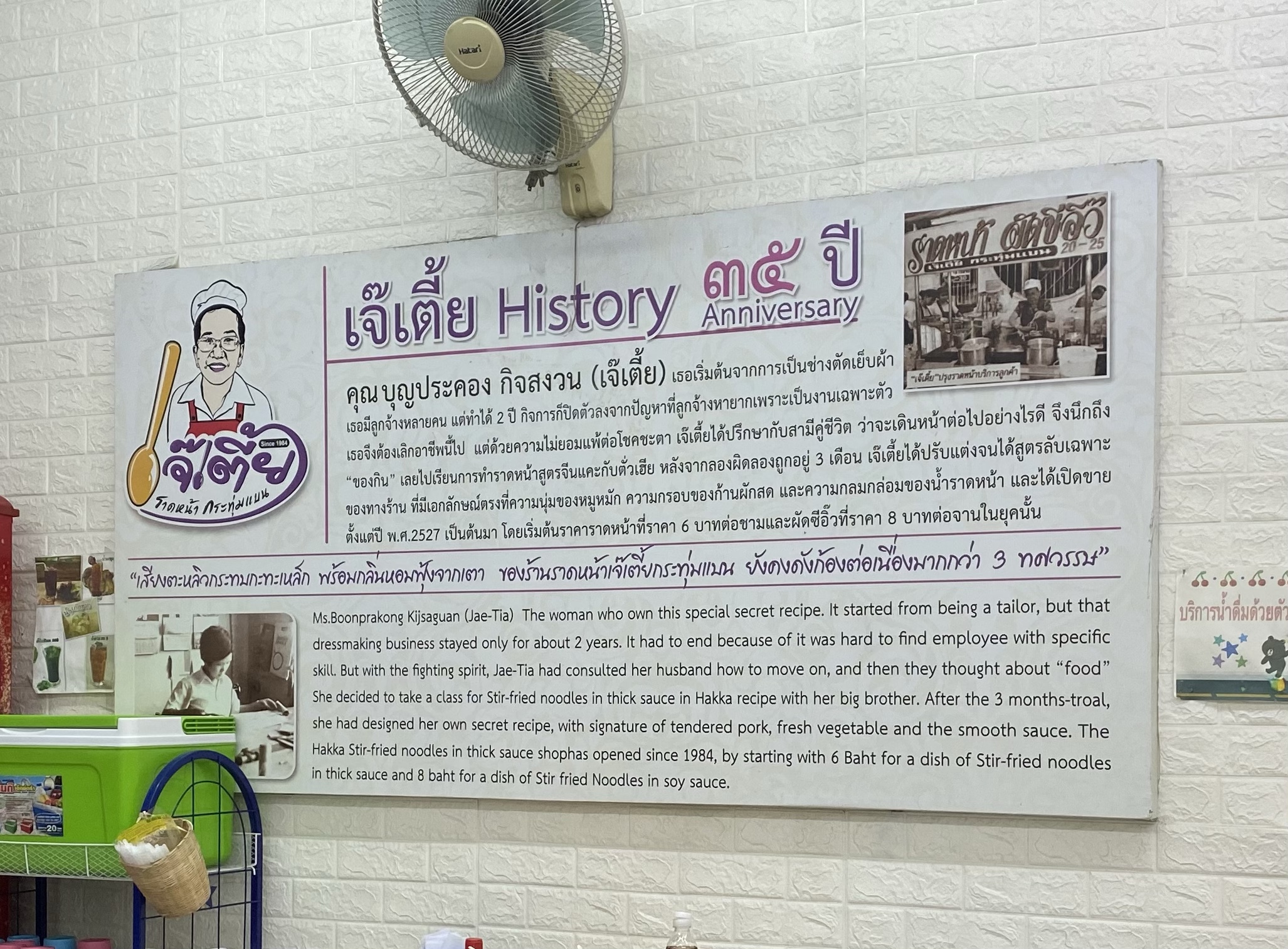 After a quick spin through the market stalls, our first priority was finding some food. The street food looked tasty but we all wanted to sit down so we found a little place with tables called Jea Tia Rad nar Krathum Baen. It was bright cheery and had the story of the owner on the wall in Thai and English but other than that there was no English anywhere. Brian took the lead trying to figure out what to order since his Google translate seemed to be deciphering the menu the best. Once we ordered we waited and wondered what exactly we’d get and how much there would be.