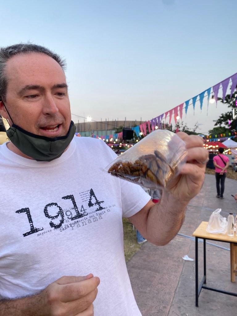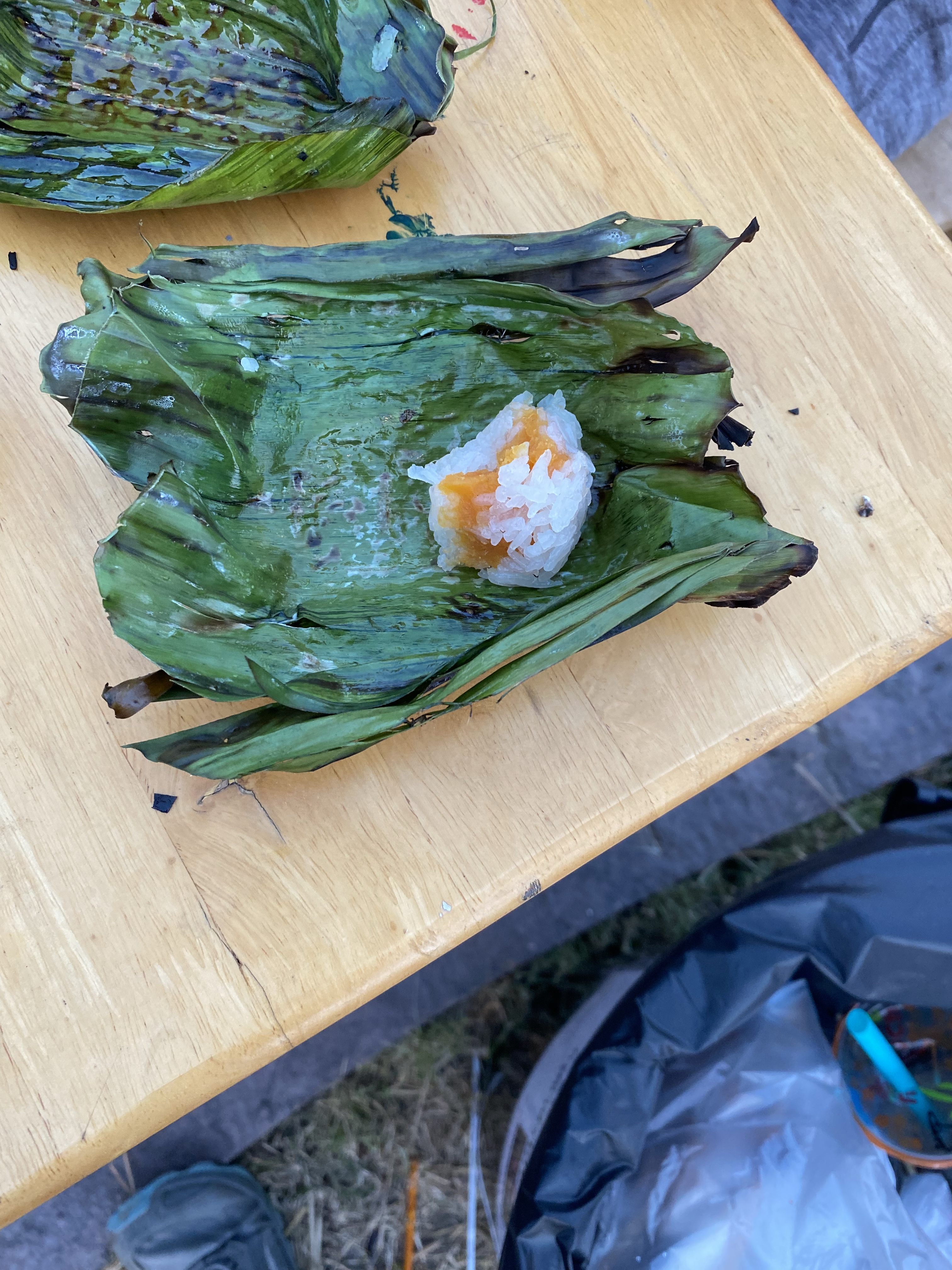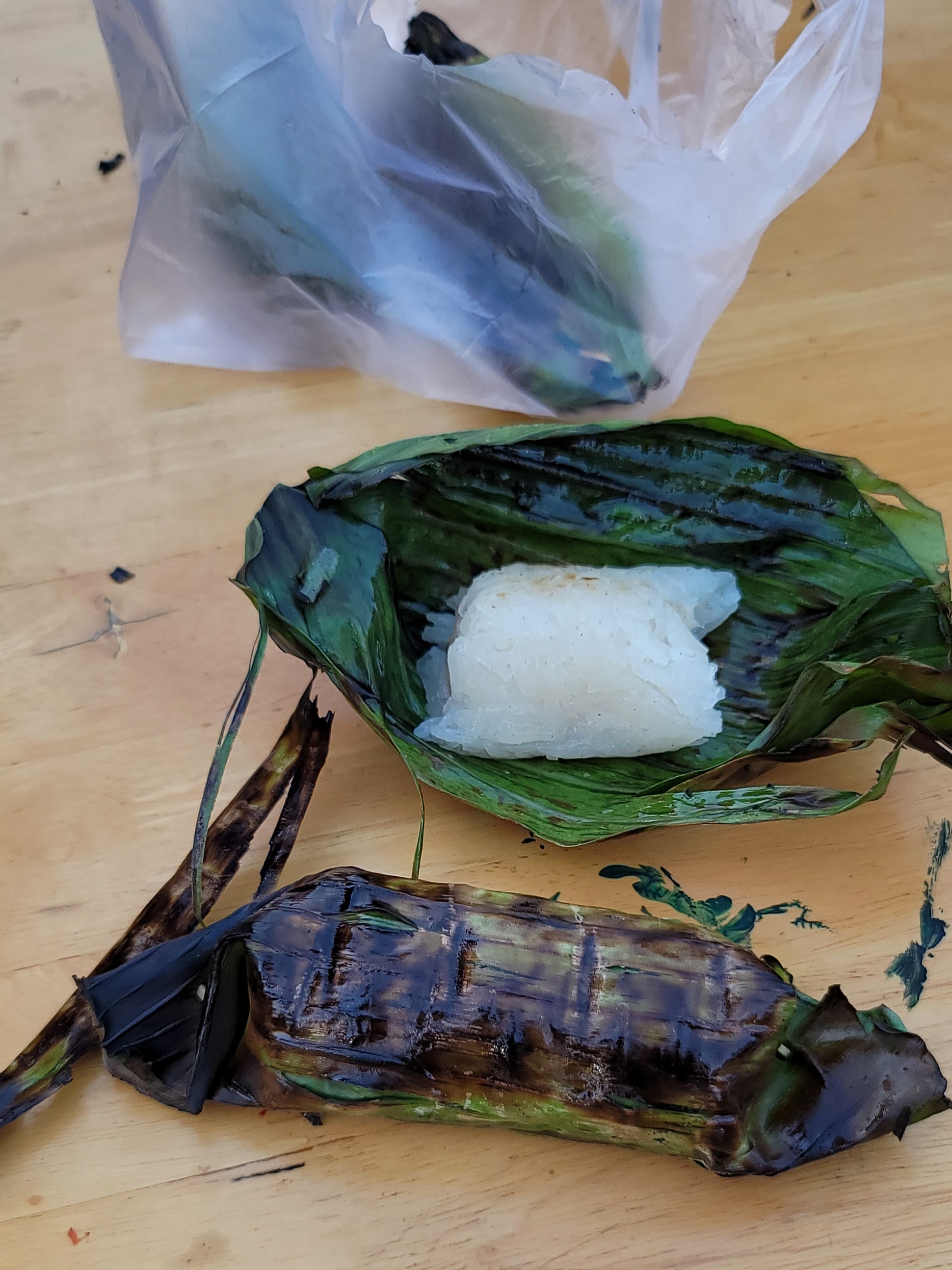 We got some potstickers and grilled chicken skewers to start. Then we had something new – sweet sticky rice wrapped around bananas and sweet potatoes that had been roasted in banana leaves over a flame. Then we had something really new – caterpillars!
