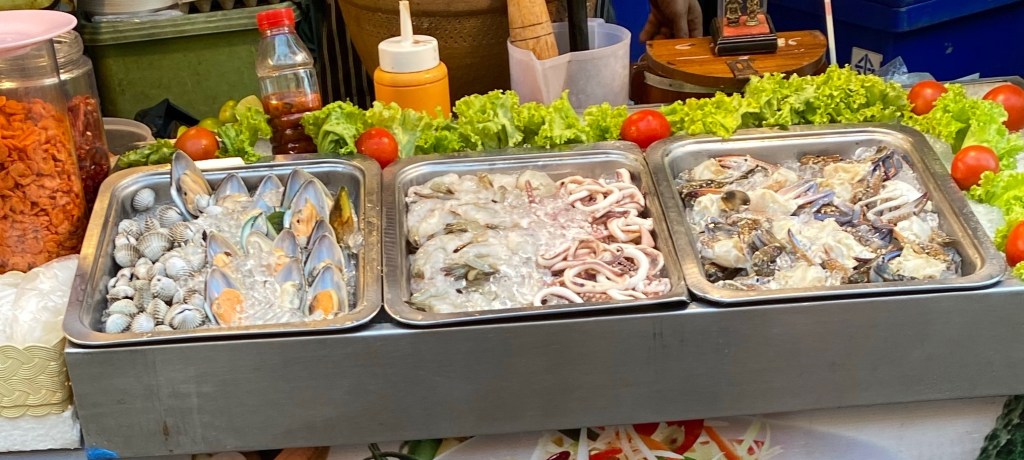 They had a blast and were totally worn out by the time they got shooed out of there by the attendant. Then it was time for something to eat. There were at least 50 food vendors in the Thai section of the market selling all kinds of familiar and not so familiar foods. In an effort to seem cooler than we are we didn’t take many photos.