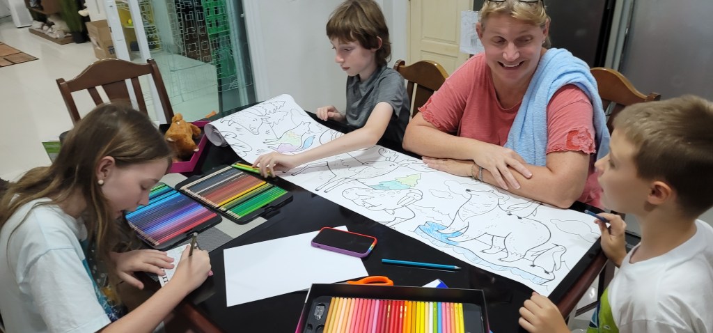 The evening saw most of the 5 Adventurers take to coloring. CreeperPuppy’s Christmas gift to Suaram was 100 colored pencils and Mom and Dad got a 10 foot animal coloring roll in their stocking – so the work began. The group spent most of the time between dinner and bed working on it or other drawing and listening to their latest favorite soundtrack – Encanto. They admitted afterwards they “had barely cracked the surface” on the ten feet (or the 100 pencils for that matter)