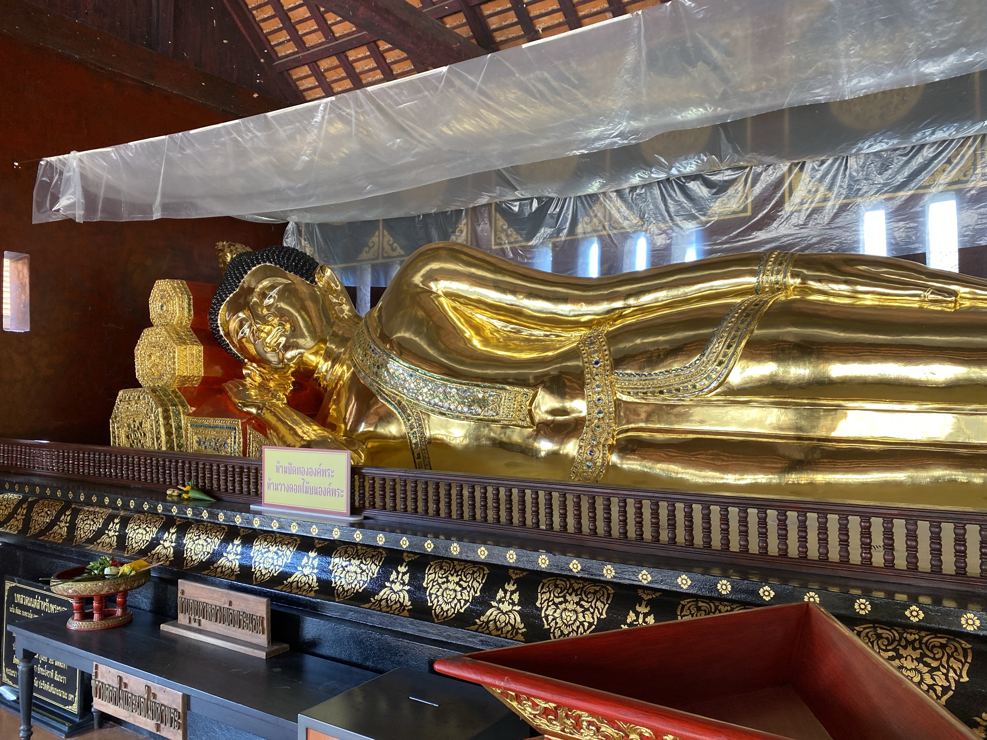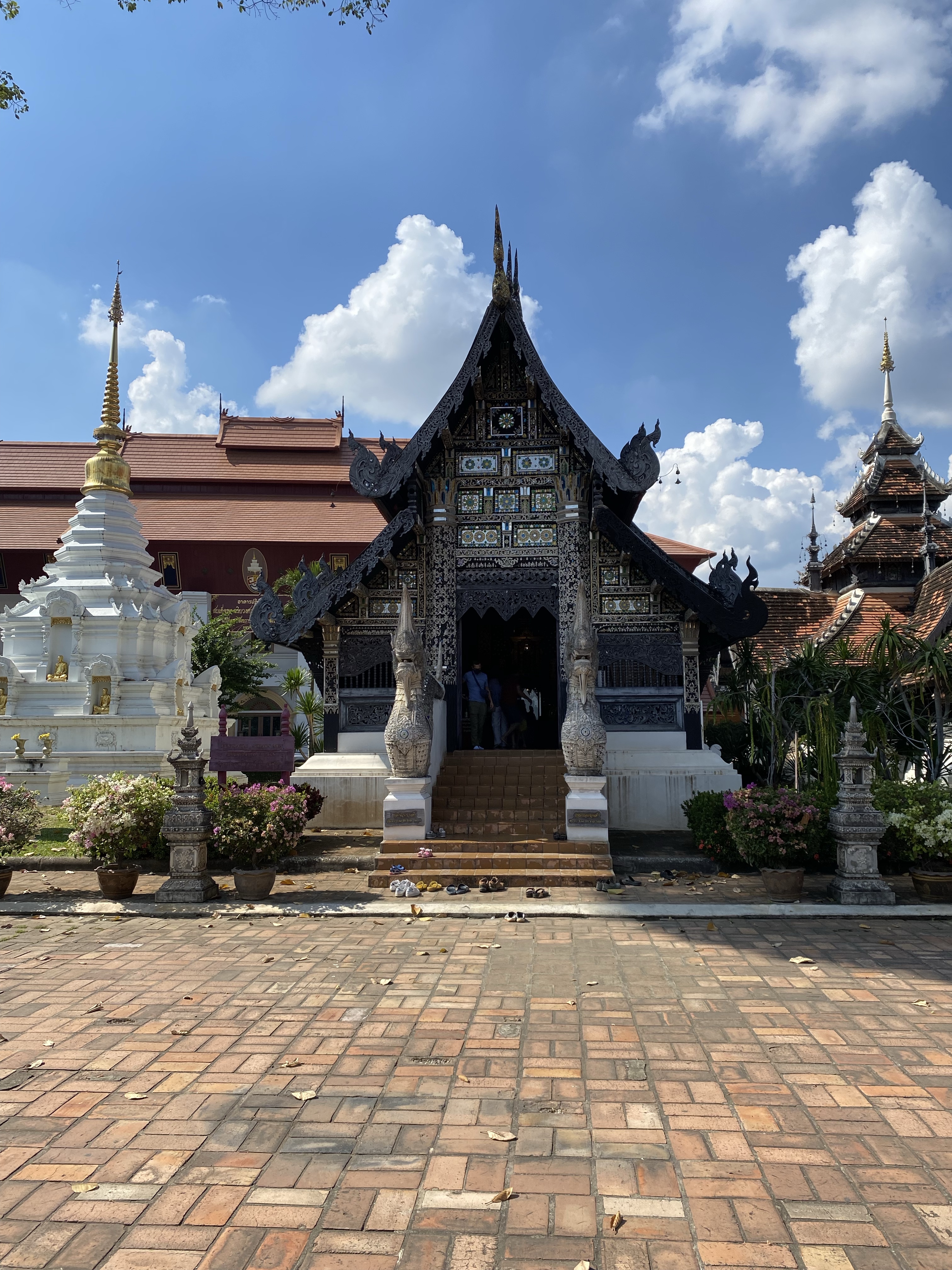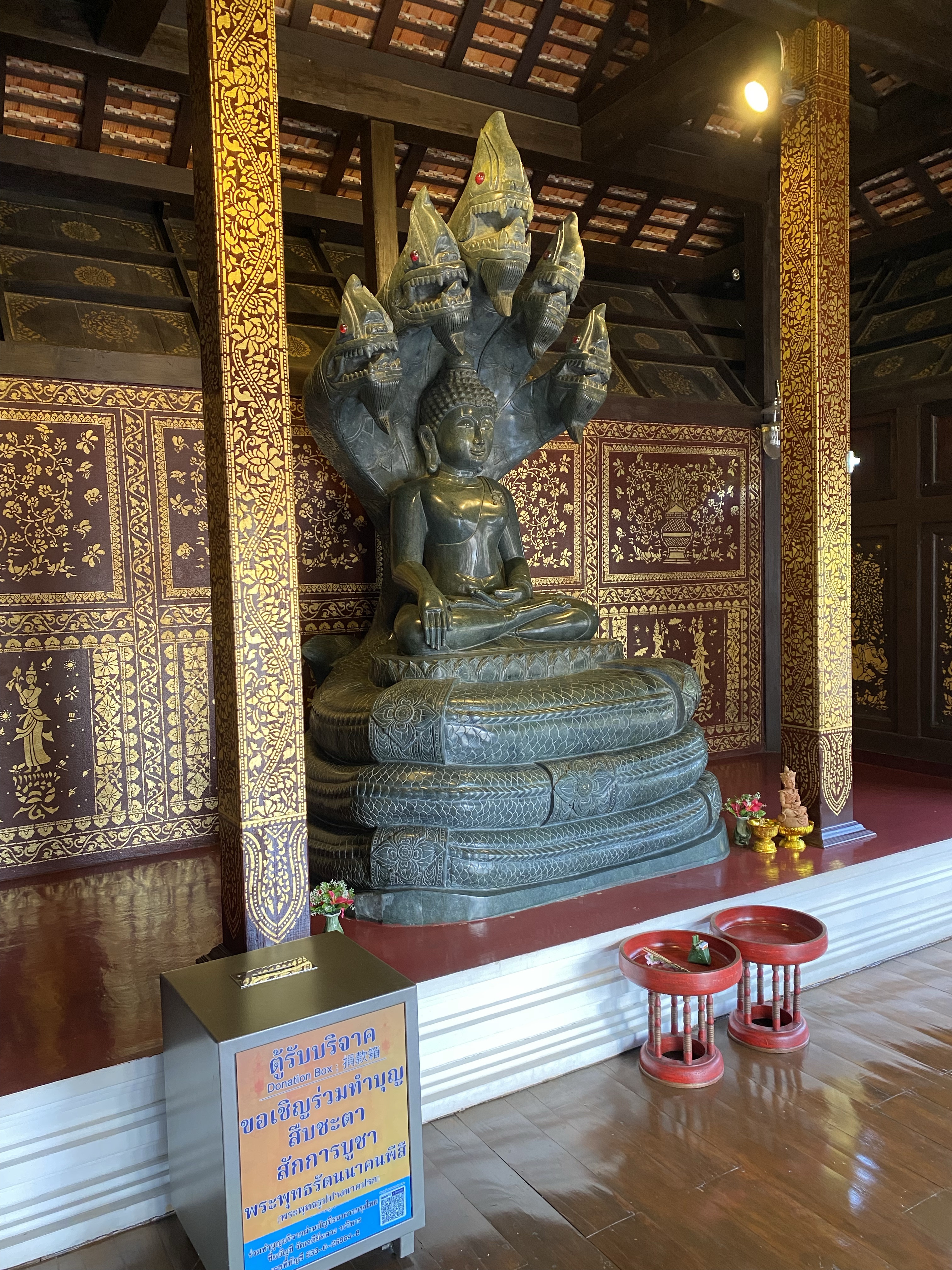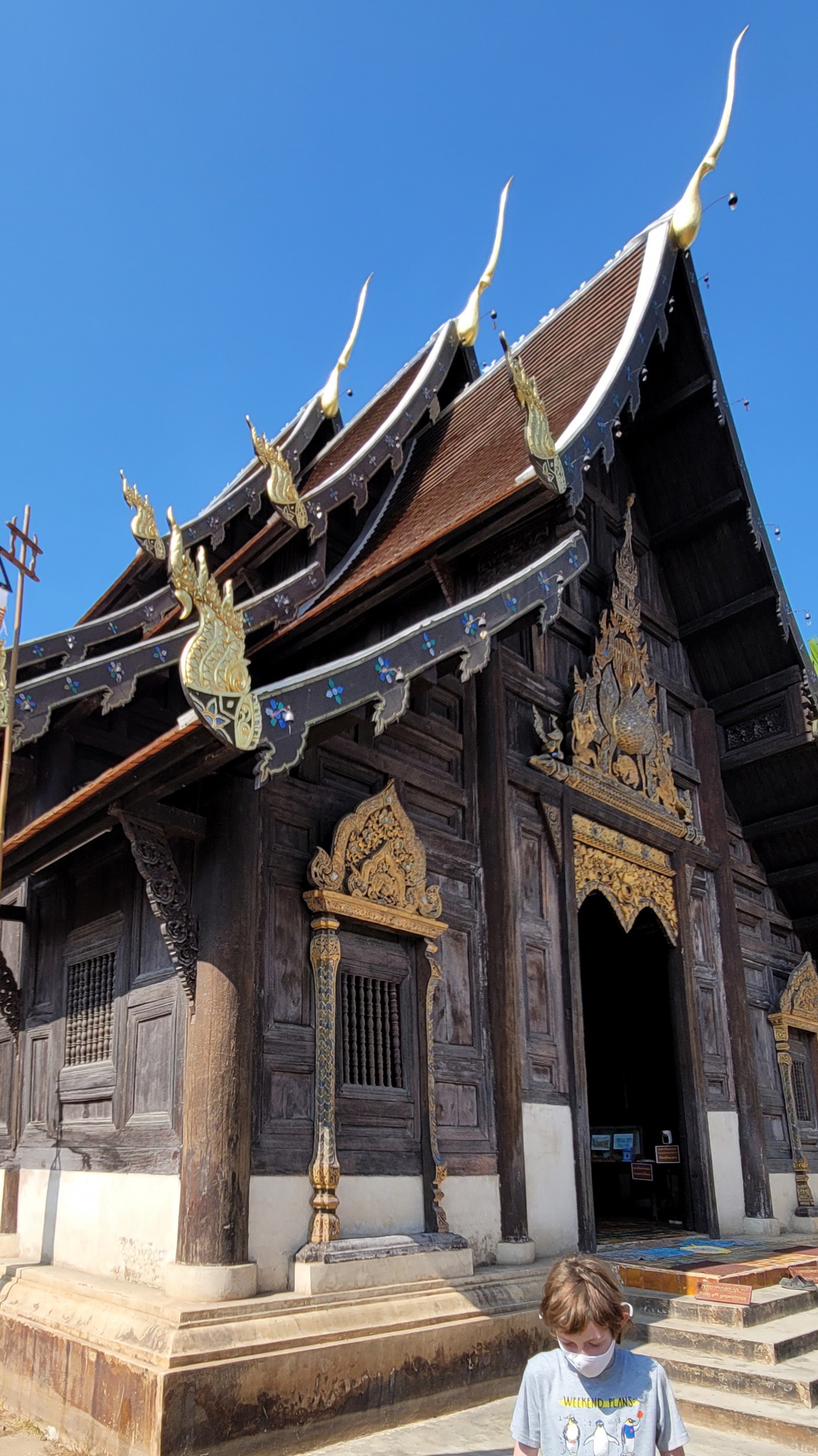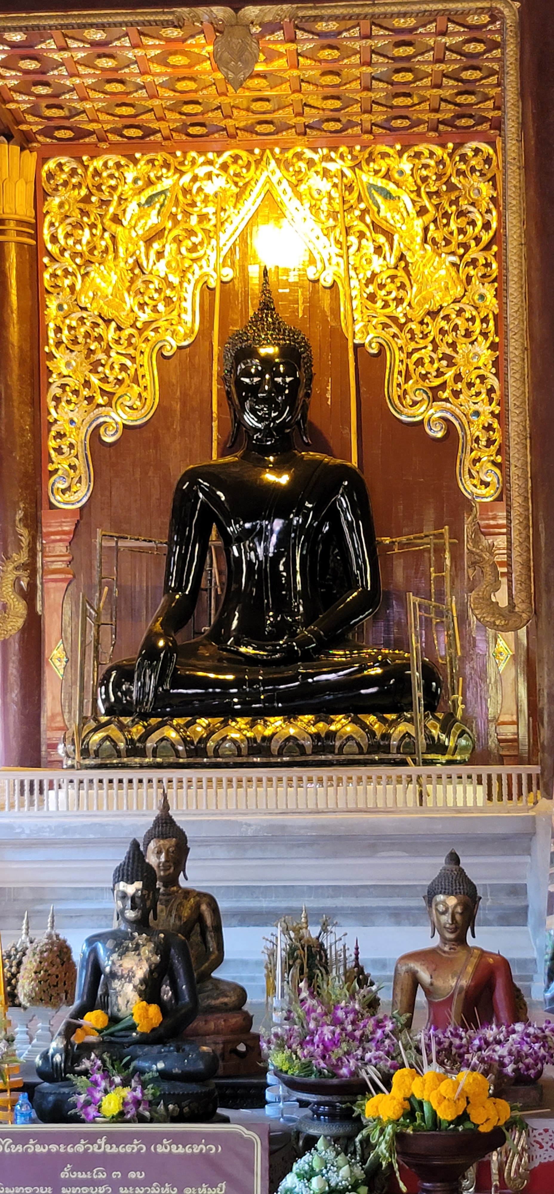 We started at Wat Phantao which is an intricately carved teak temple which is unusual- it was built during the peak of the teak trade and the wood was an offering to Buddha. Inside it had a very large sitting Buddha statue – our first of the day. Typically this Buddha is covered in bright gold leaf but is undergoing renovation. Today it was shiny black lacquer which was still very impressive.