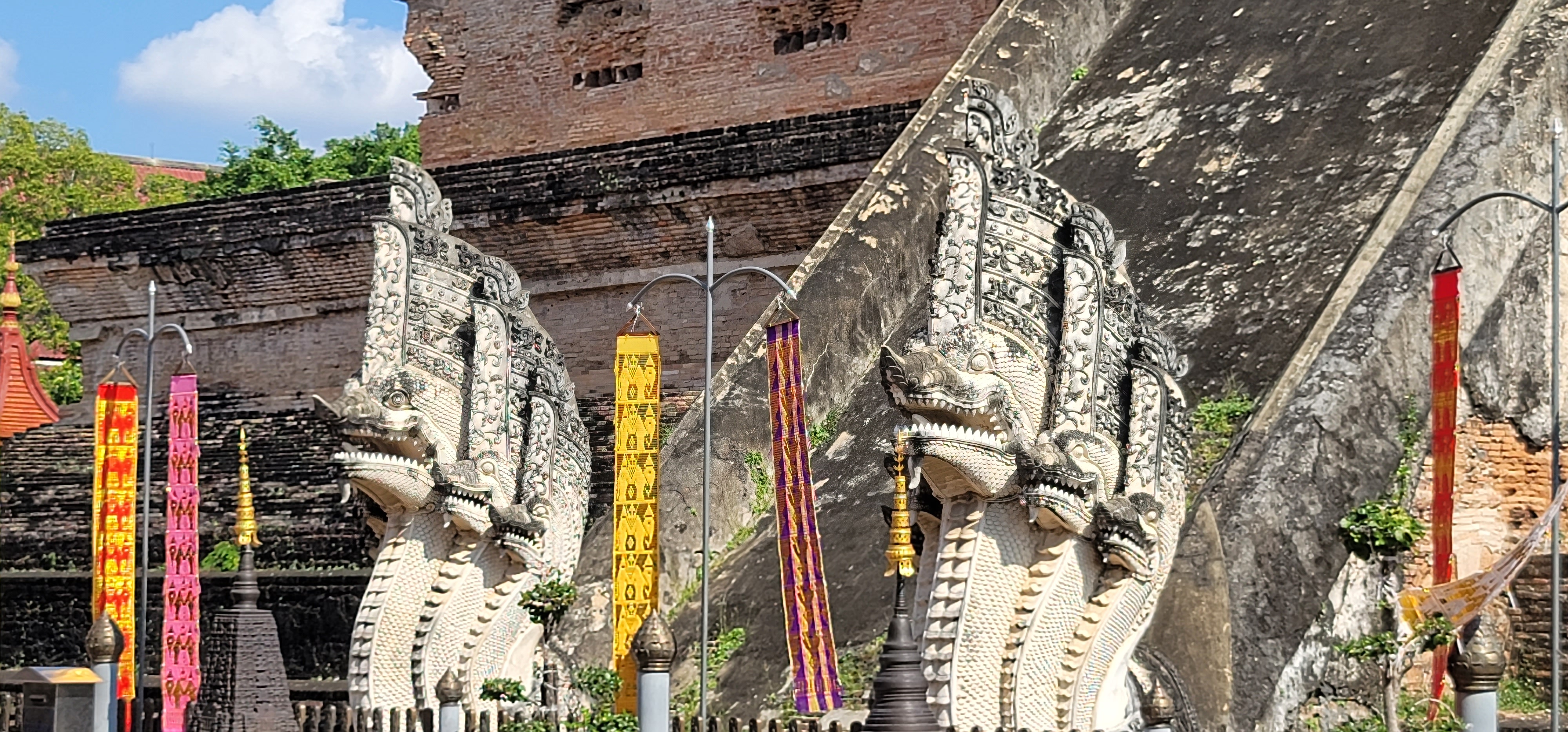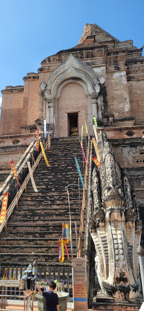 Next we went to Wat Chedi Luang Stupa which was once the largest building in Northern Thailand at 82 meters tall. An earthquake partially collapsed it in 1545 and it was reconstructed in the 1990’s. The size and architecture are impressive and there is remaining detail on some of the structure that is amazing, particularly the nagas (multi-headed dragons or serpents) protecting the Buddha at the entrances.