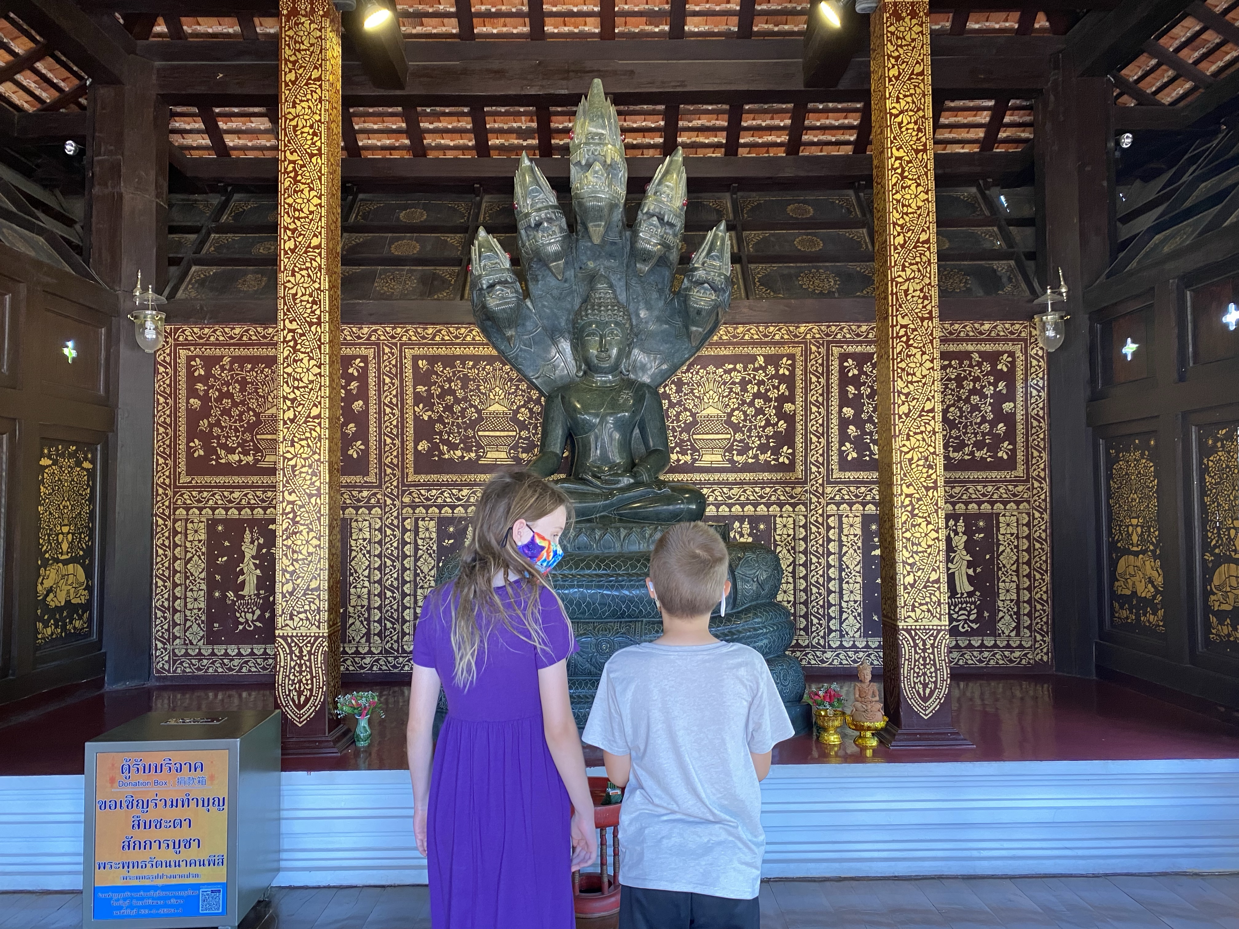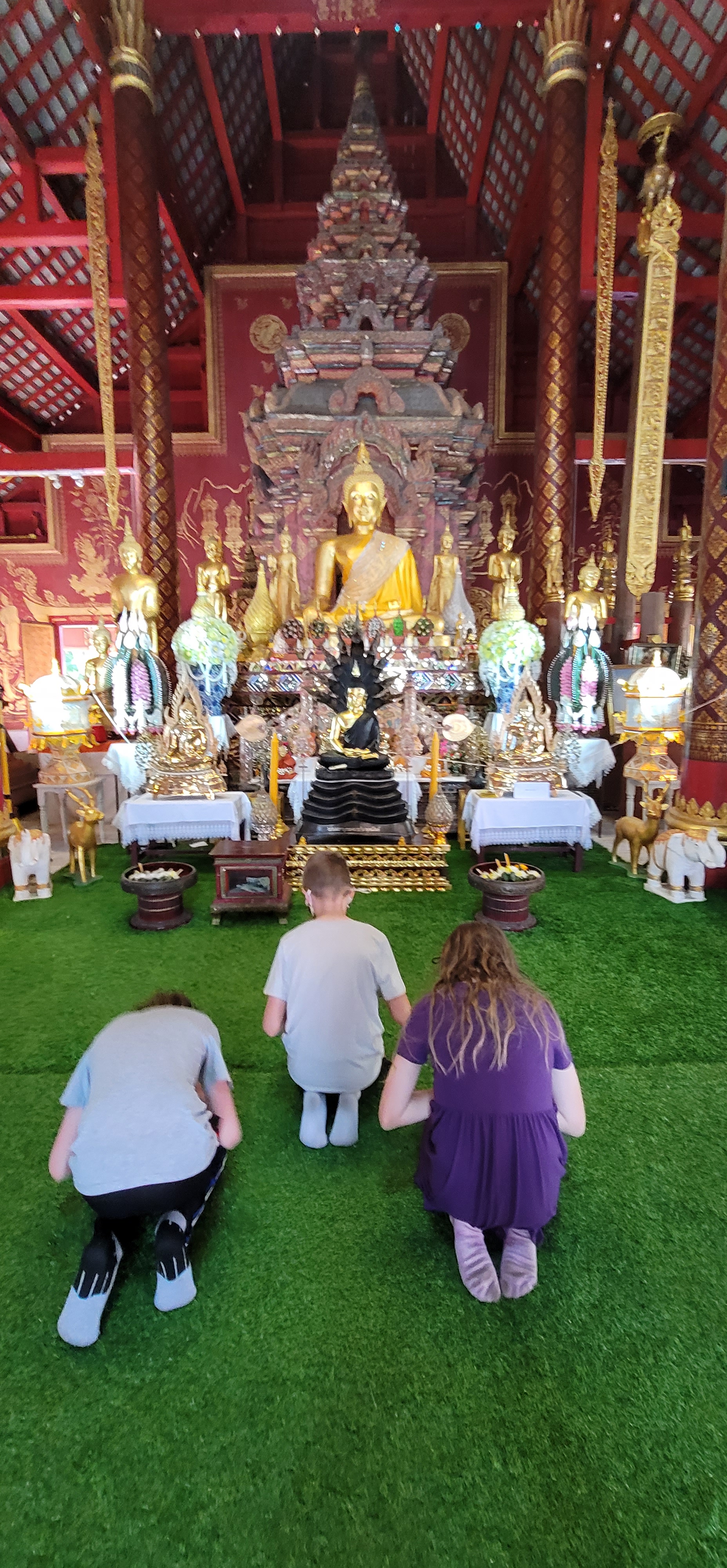 The larger prayer house uses a traditional Thai architecture structure (mondop) for the alter surrounded by Buddha statues. We had instructed the kids to be respectful of Buddhist traditions and the sacred places we would see – they were inspired to take it further than we expected.
