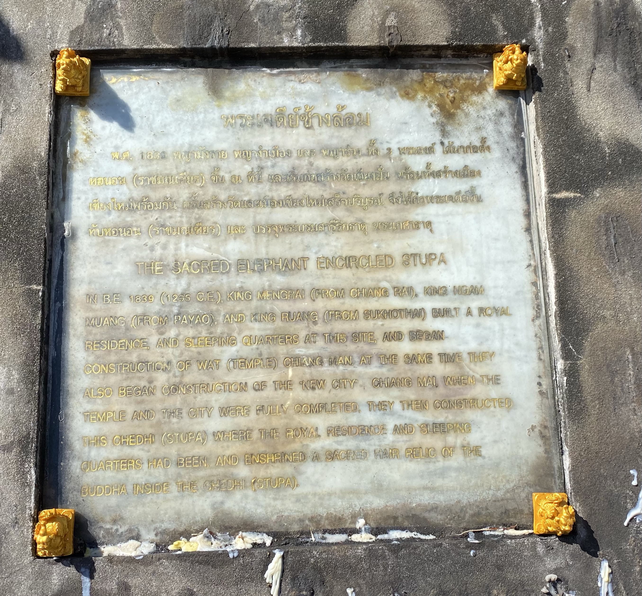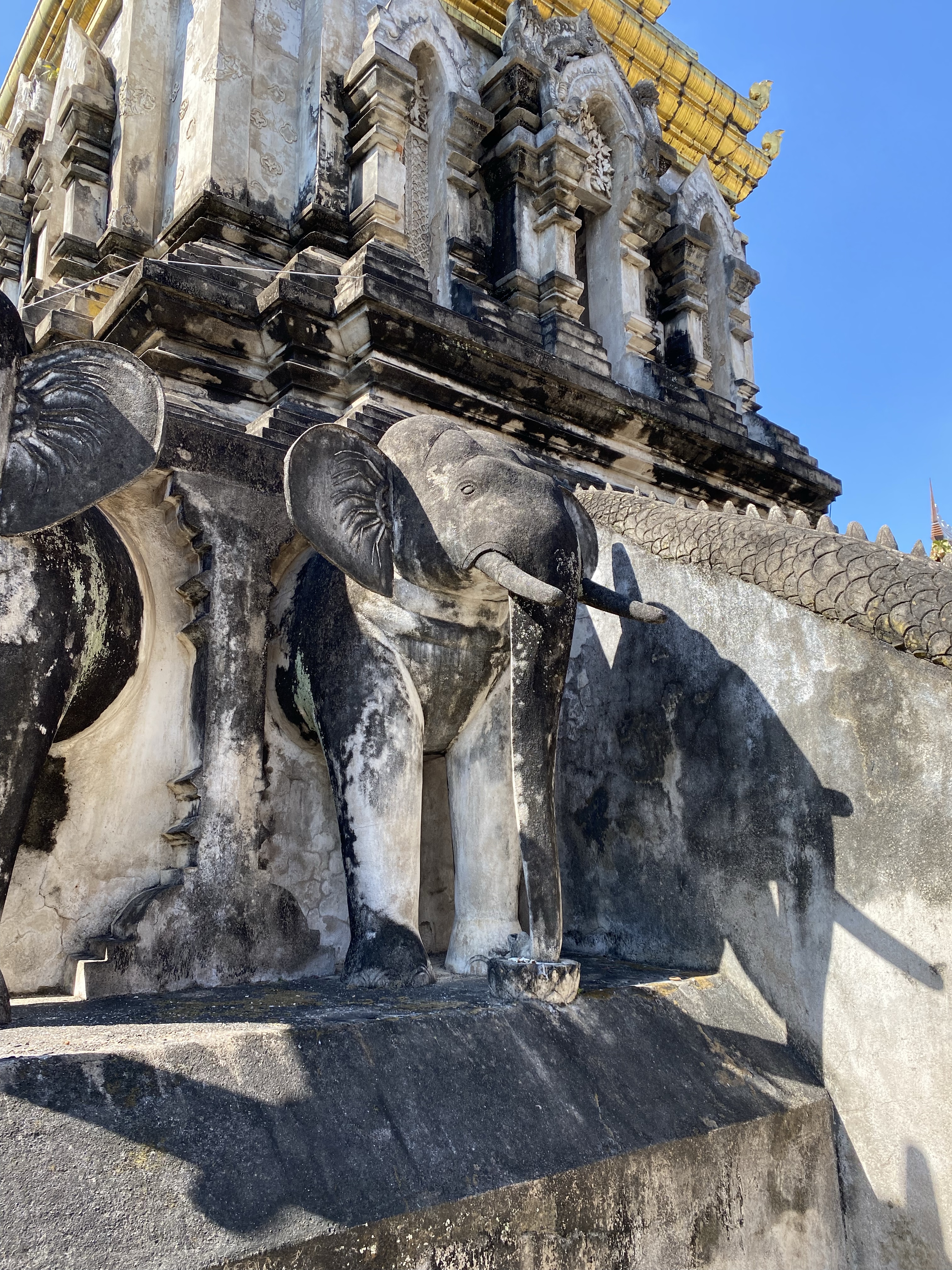 It was a little hot and sunny so we made a quick pit stop for cold water and mango sticky rice. Then we headed to our last stop of the day Wat Chiang Man. This is the oldest temple complex in Chiang Mai and the oldest structure in it is the Elephant Chedi. The square base supports a second level which has the front half of 15 life-sized brick-and-stucco elephants emerging from it.
