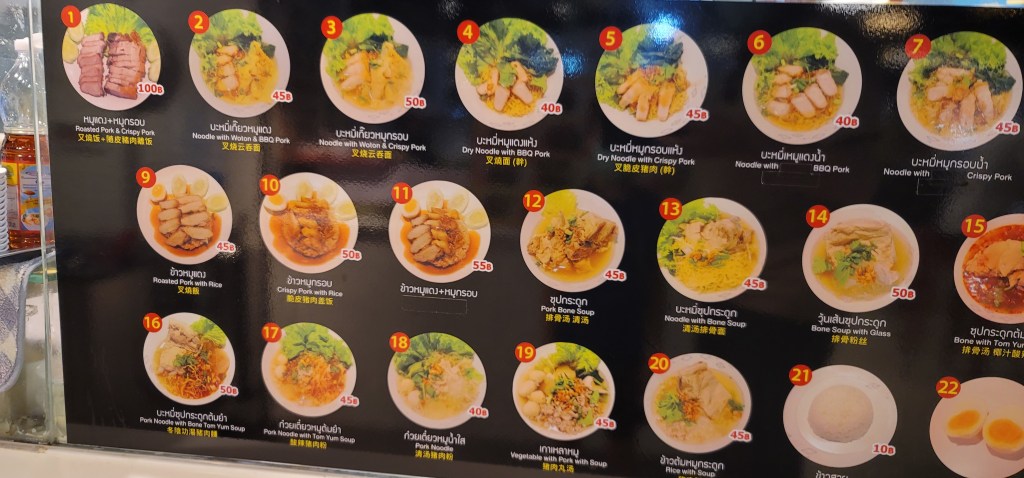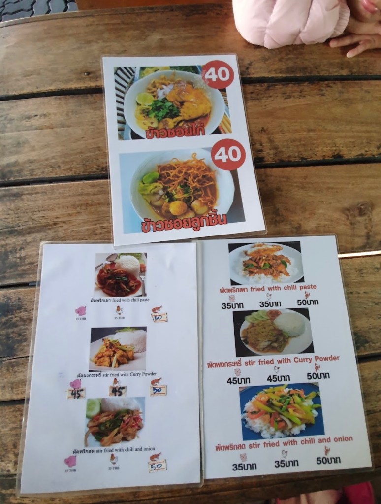 Or sometimes, like ป้าแดง ขนมเส้นในซอย – a place around the corner from us – they have pictures, including a cartoon pig, chicken or shrimp so you can pick your protein.