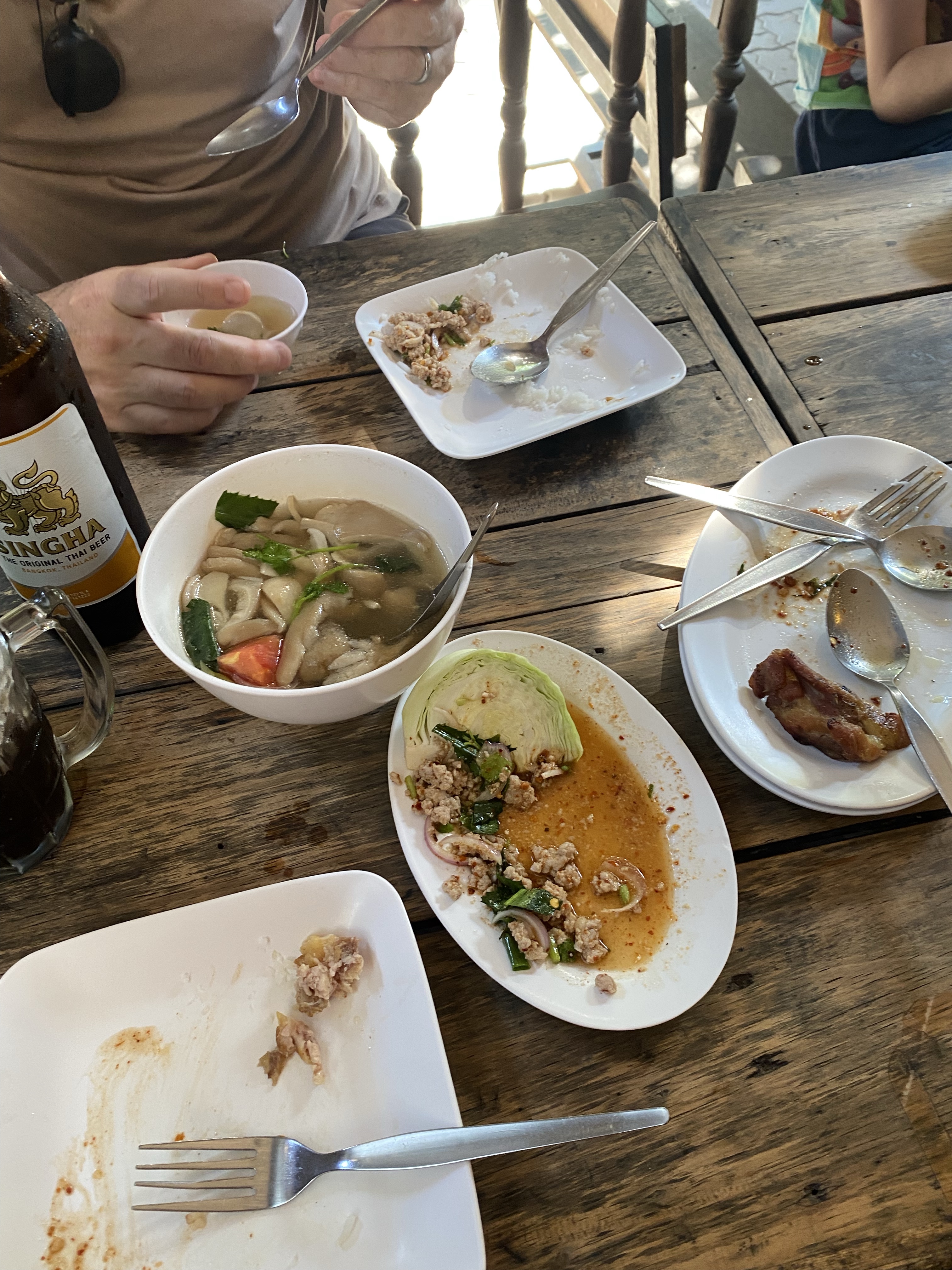 The restaurant name translates to Aunt Daeng, Snacks in the Alley and we’re pretty sure she cooked for us. It doesn’t look fancy and the day we were there they had a pork slab hanging to salt cure in the sun. The food is terrific and only $1-2 for each dish. Yum! Maybe we’ll eat there a couple times tomorrow.