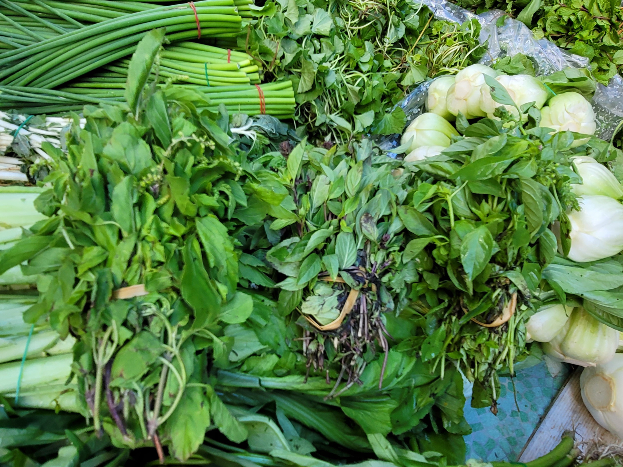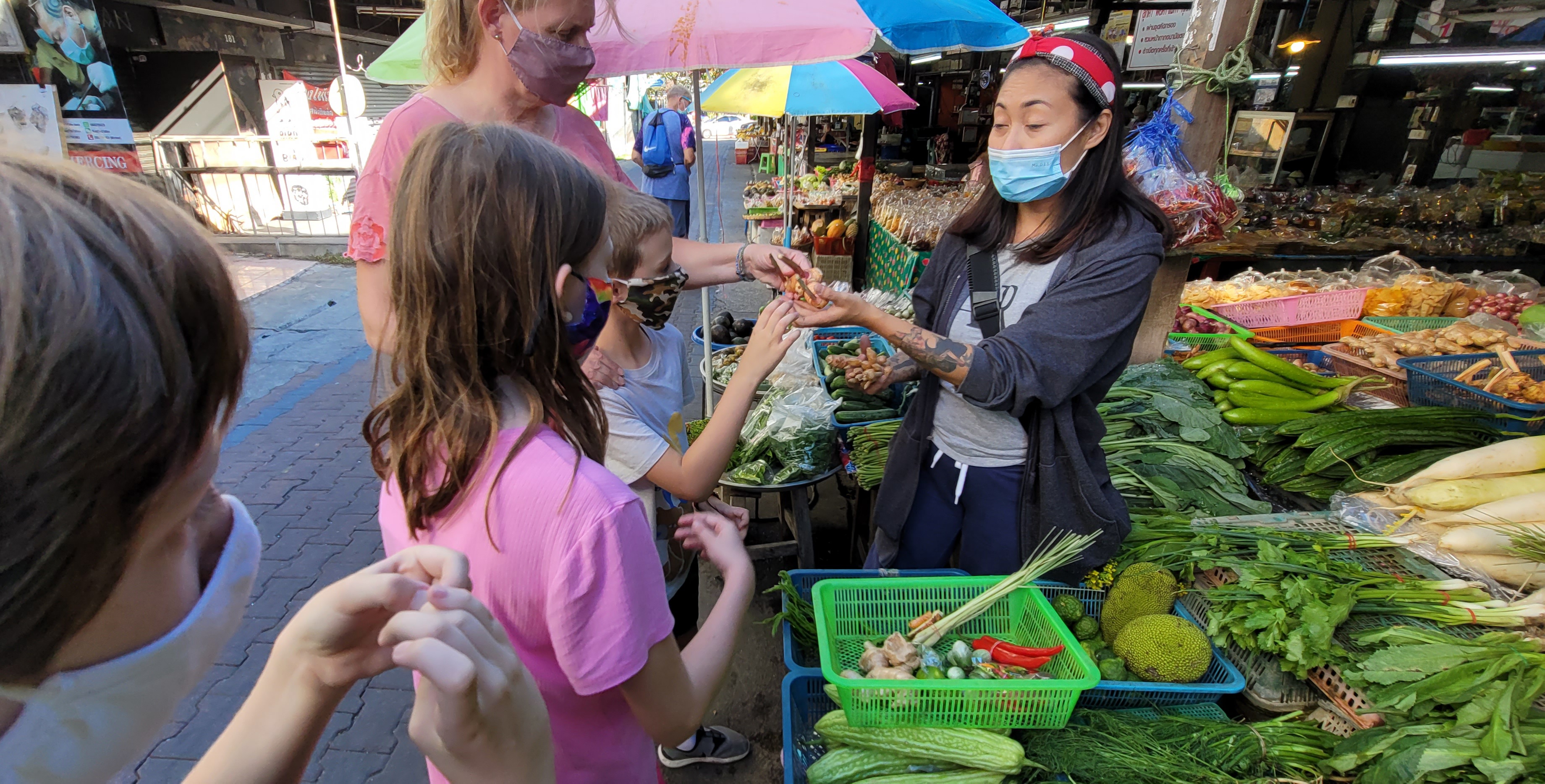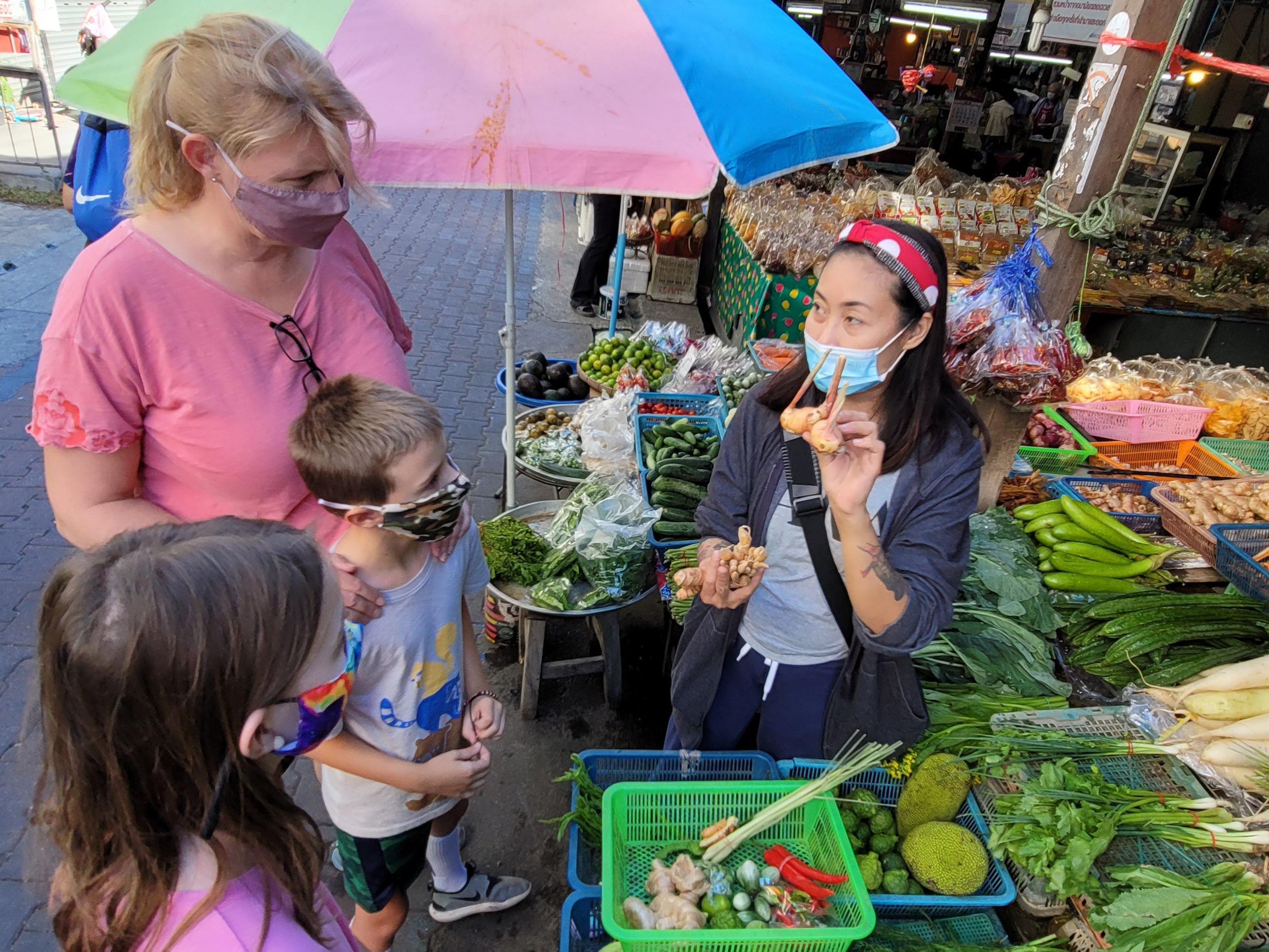 After being picked up at our house, our first stop was the market to learn about the typical Thai seasonings and ingredients. We have eaten Thai food and have been to the Thai markets, but it was really helpful to have someone explain the market items that go into the food prior to when theyโve been prepped. We looked, touched and smelled our way through 4 types of ginger, 3 types of basil, lumpy kaffir limes, tiny green eggplants small Thai garlic and much more.