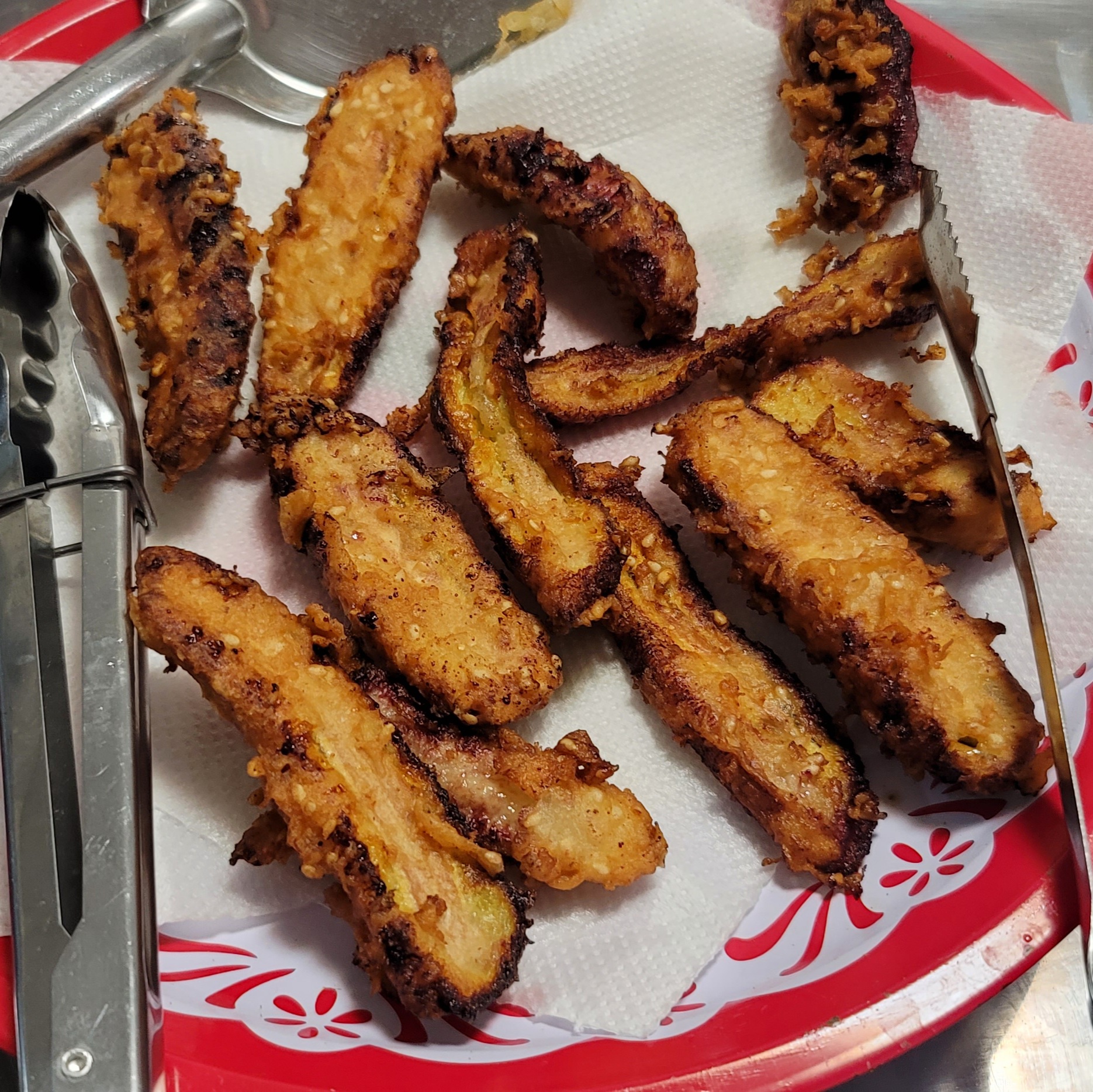 Next we cooked the dessert course because it had to cool and the rice needed to soak. We chose fried bananas and the classic mango sticky rice. The kids made coconut milk by soaking the shredded coconut from the market in water and squeezing out the liquid through cheesecloth. They sweetened it to use with the dessert and we used it in our next dish.