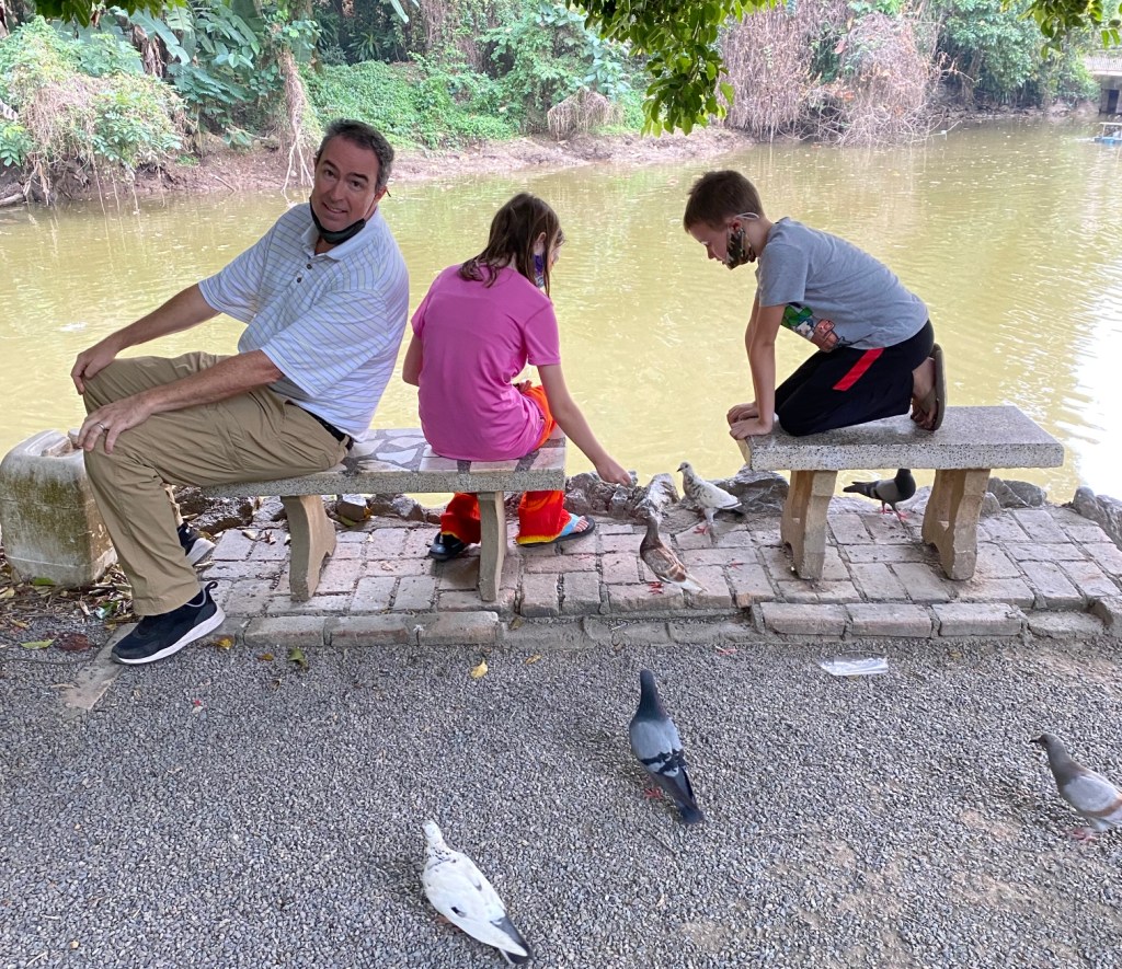 We invested 30 baht in fish food and watched some large catfish devour every pellet they could find. The pigeons seemed to recognize that food was in their midst and flocked closely for a meal. Suaram had one land one her shoulder. Clearly these birds haven’t been chased enough to be wary of the kids.