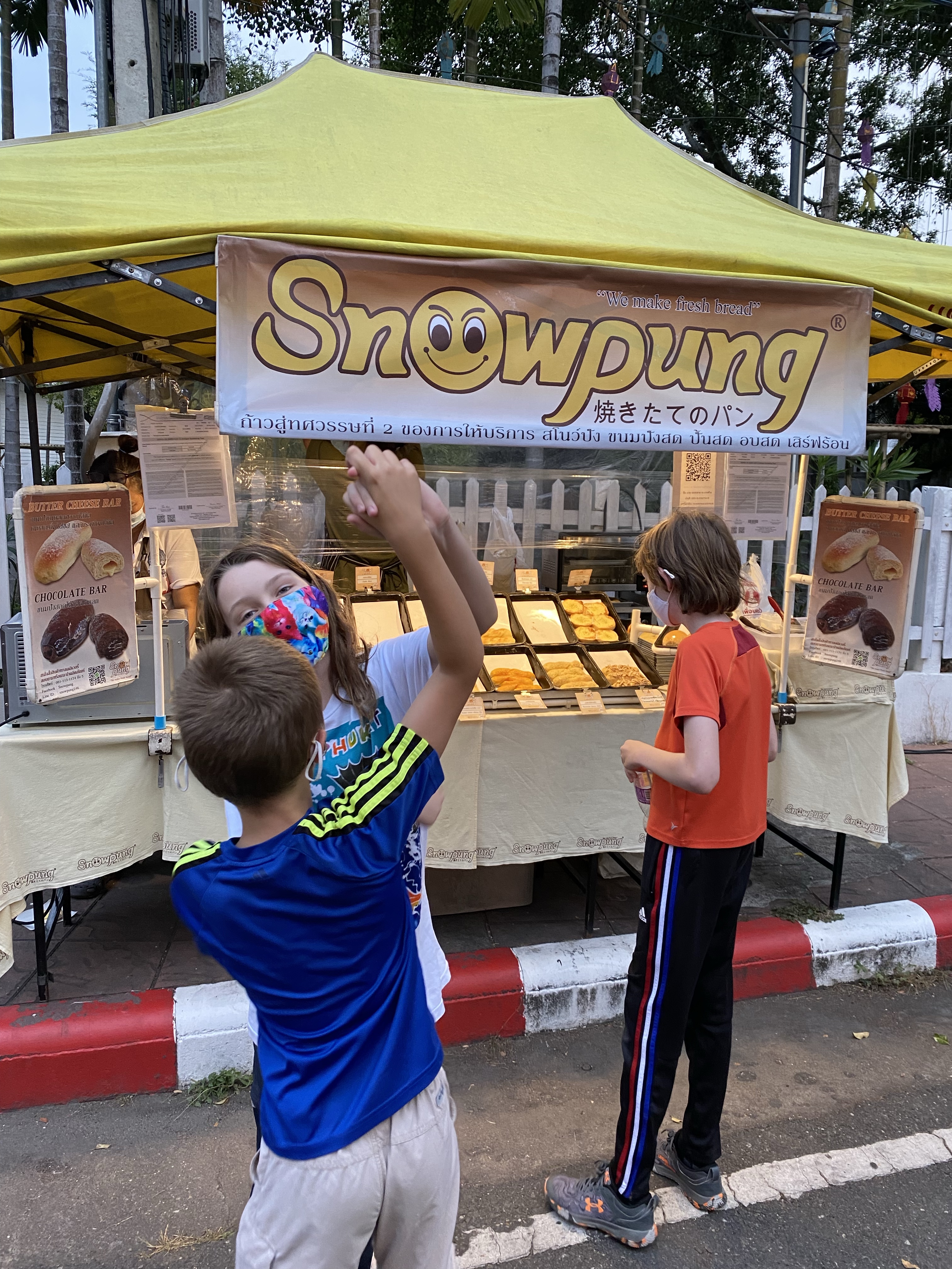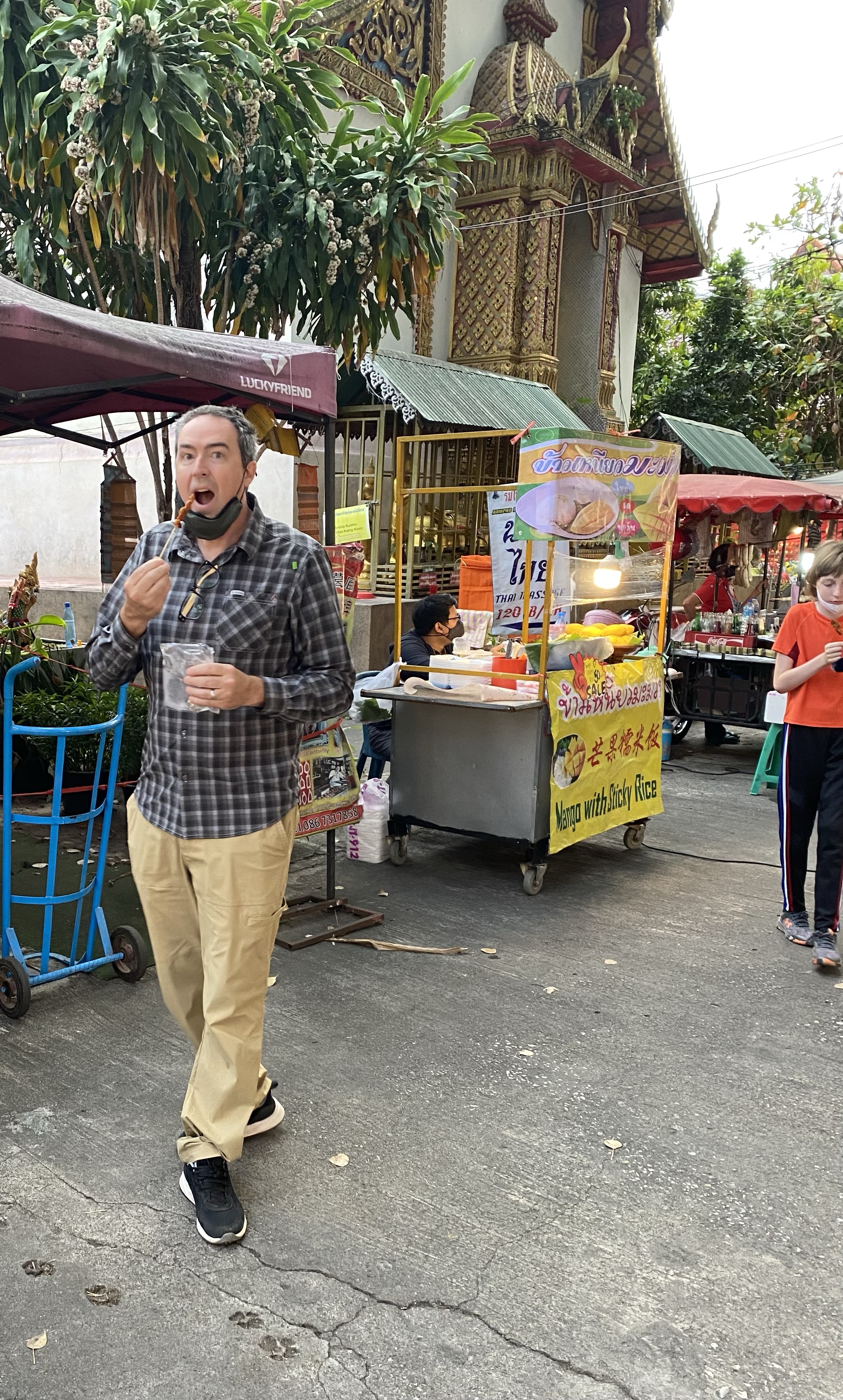 After seeing the wat we crossed the road to the market and (after showing our proof of vaccination, getting temperature checked and signing in for contact tracing) almost immediately started shopping for items we didn’t know we needed/wanted. Brian bought socks. Tiffany bought a rope sculpture. Suaram bought earrings and CreeperKitty bought a fuzzy keychain and a wooden puzzle.