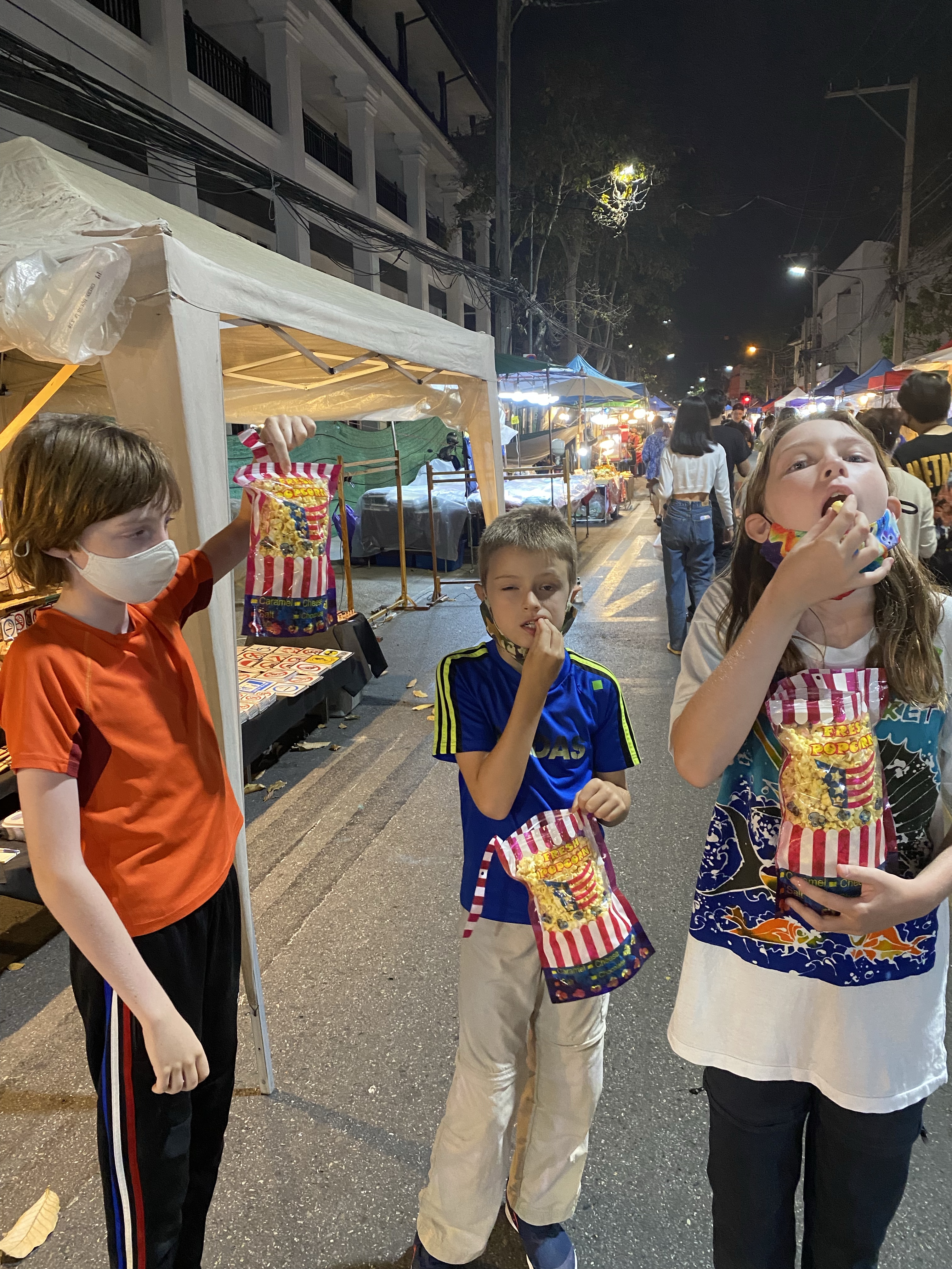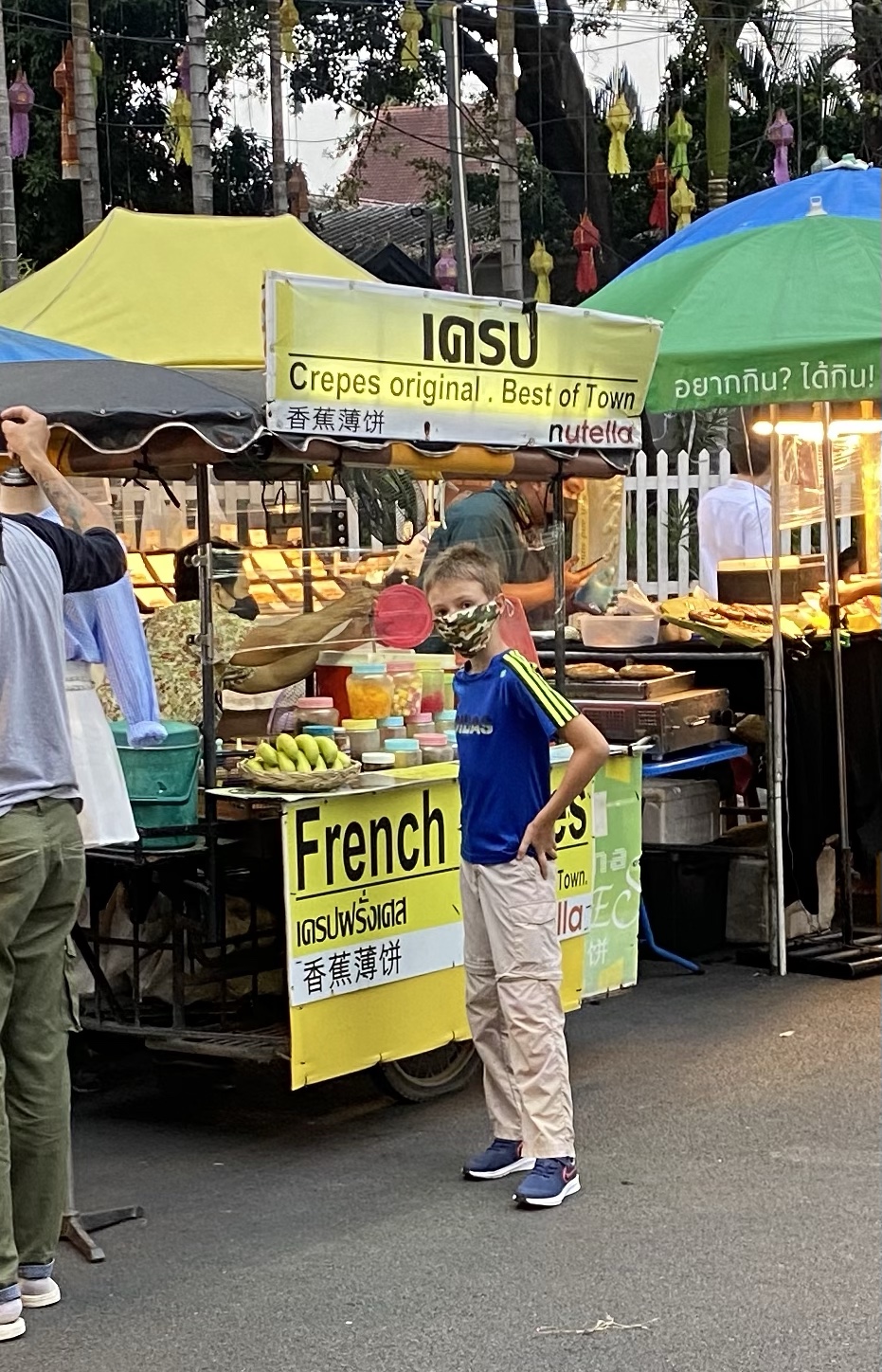 Our food options were very diverse as were our choices. Brian is eating some pork satays, the kids ate popcorn, CreeperPuppy waited for a cinnamon crepe. We even ate a half dozen perfectly fried quail eggs, some breadsticks and Dutch style pancakes filled with creamed red beans. A very strange mix of foods based on the vendor location and the whim of our appetite as we walked the street.