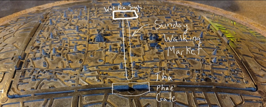 The walled Old City is the location for this market and it is held along a 1km stretch of the main road. This is a metal scale model of the Old City found at the Phae Gate. We’ve noted some of the landmarks from today.
