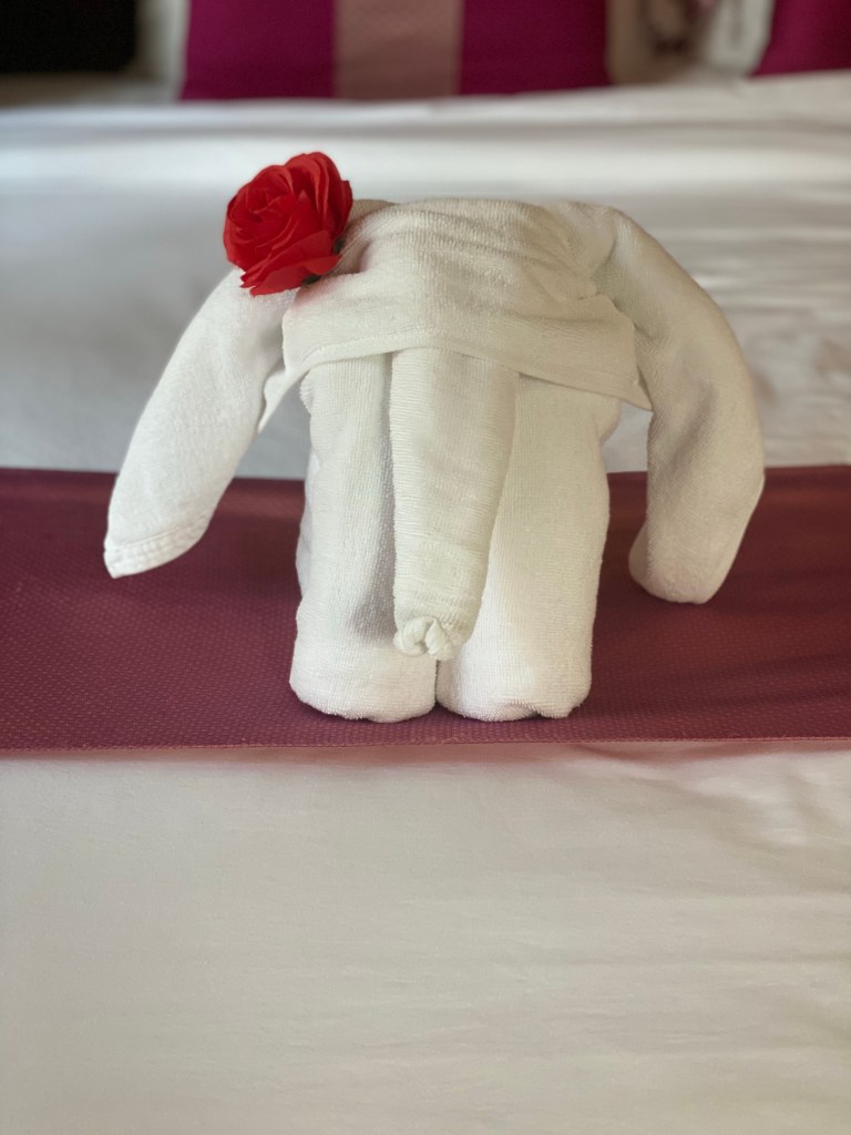 We are staying in a very charming place which has one room bungalows dotted throughout the landscaped grounds. After we said hello to our herd of towel elephants and settled in, we took a quick (if you call 1km quick) walk into town. We’re looking forward to spending more time there, all we accomplished today was to grab some dinner and check things out in advance of our next couple days of exploration.
