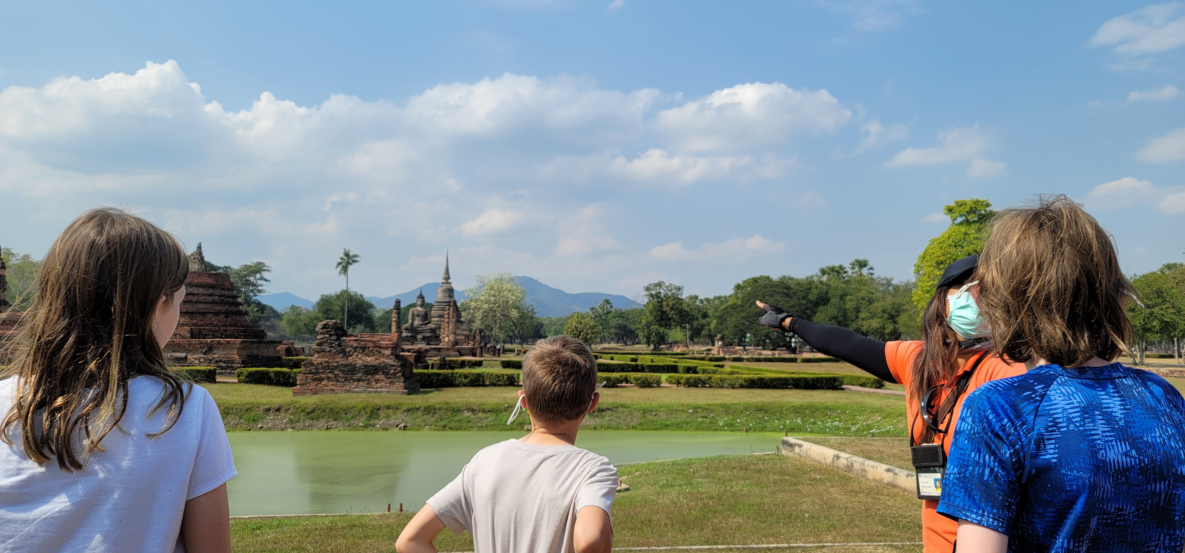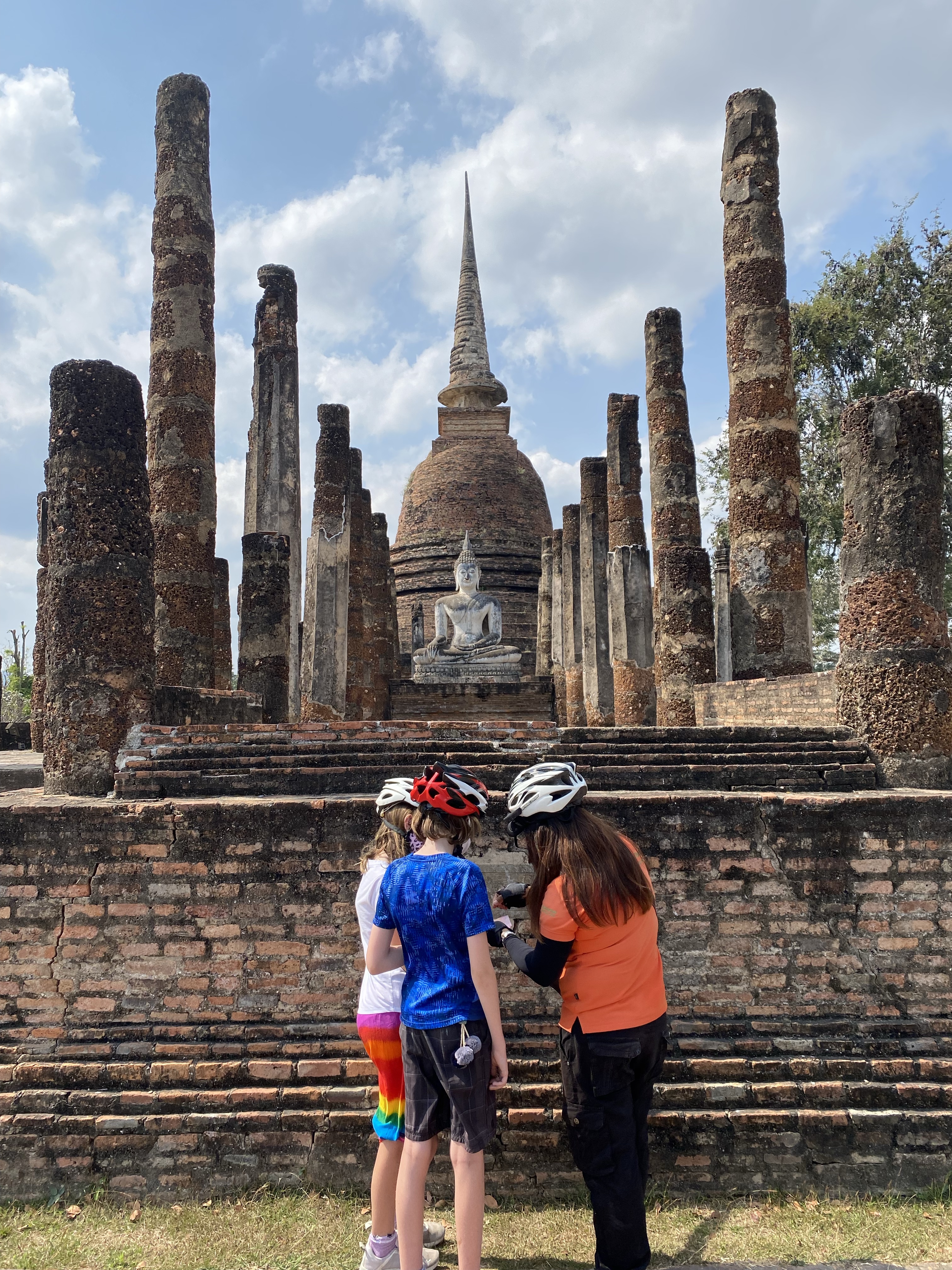 Today we continued our Adventures in the ancient city of Sukhothai – but this time we had an expert local guide and more transportation than our feet. It still involved our feet, but included 10 wheels!