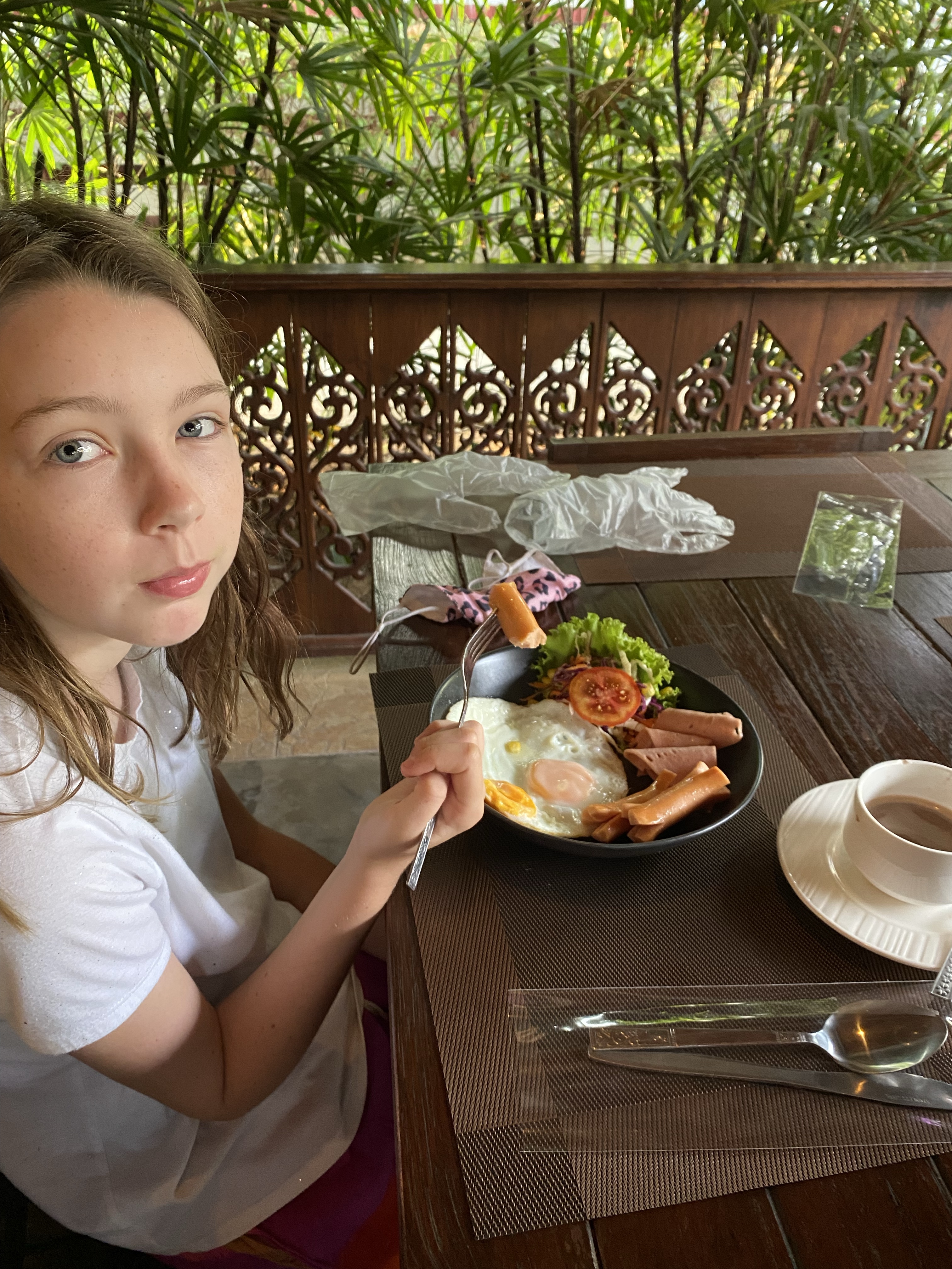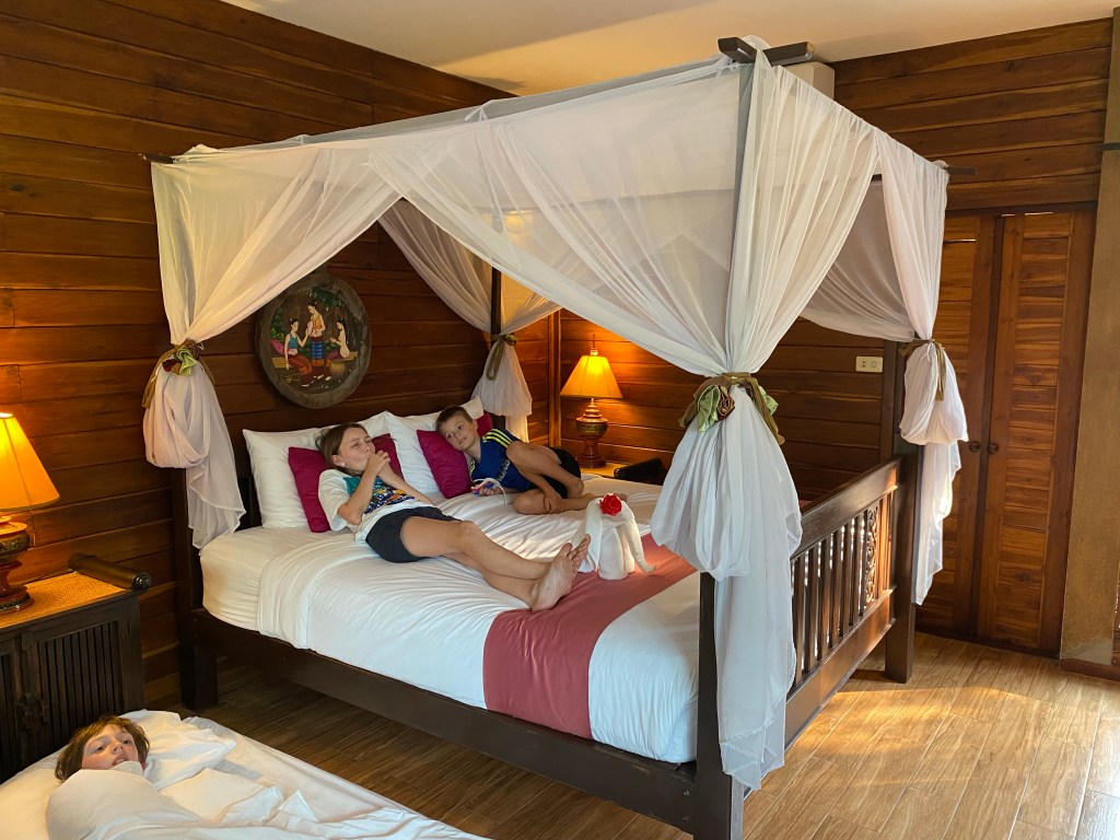 Sometimes there is a sofa bed in the room, sometimes we’ll request an extra bed – at the Thai Thai Sukhothai Resort we got a mattress on the floor – which surprisingly the kids all wanted to sleep in. Luckily we stayed three nights so they each got a turn. You can’t see it in the photo but there is a king size bed for the parents to the left of the mattress and a couch and table/chairs out on the porch.