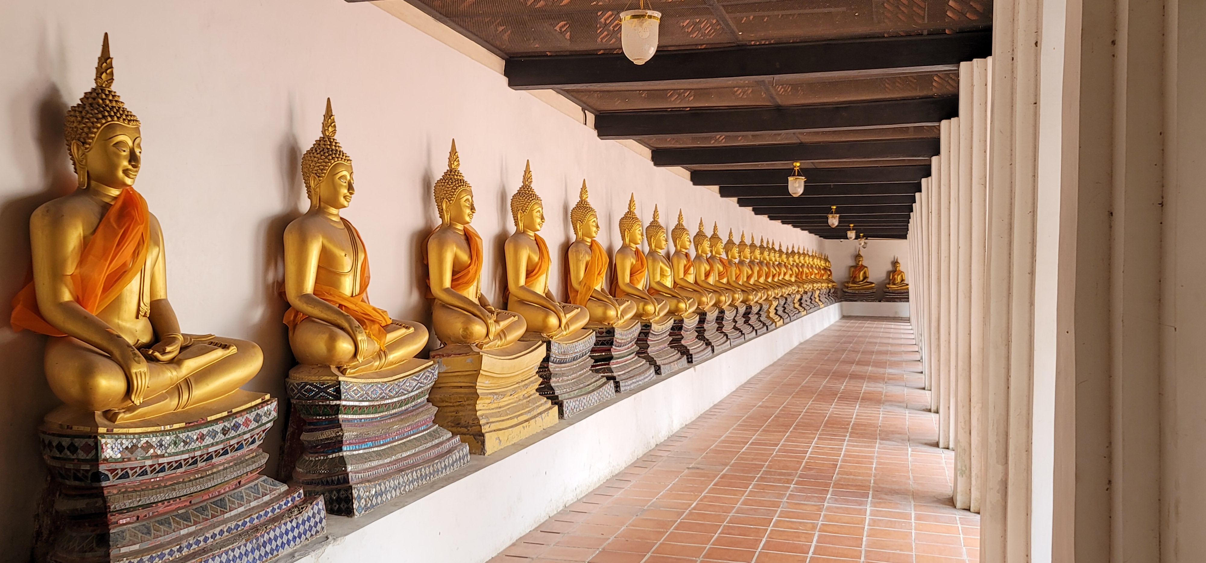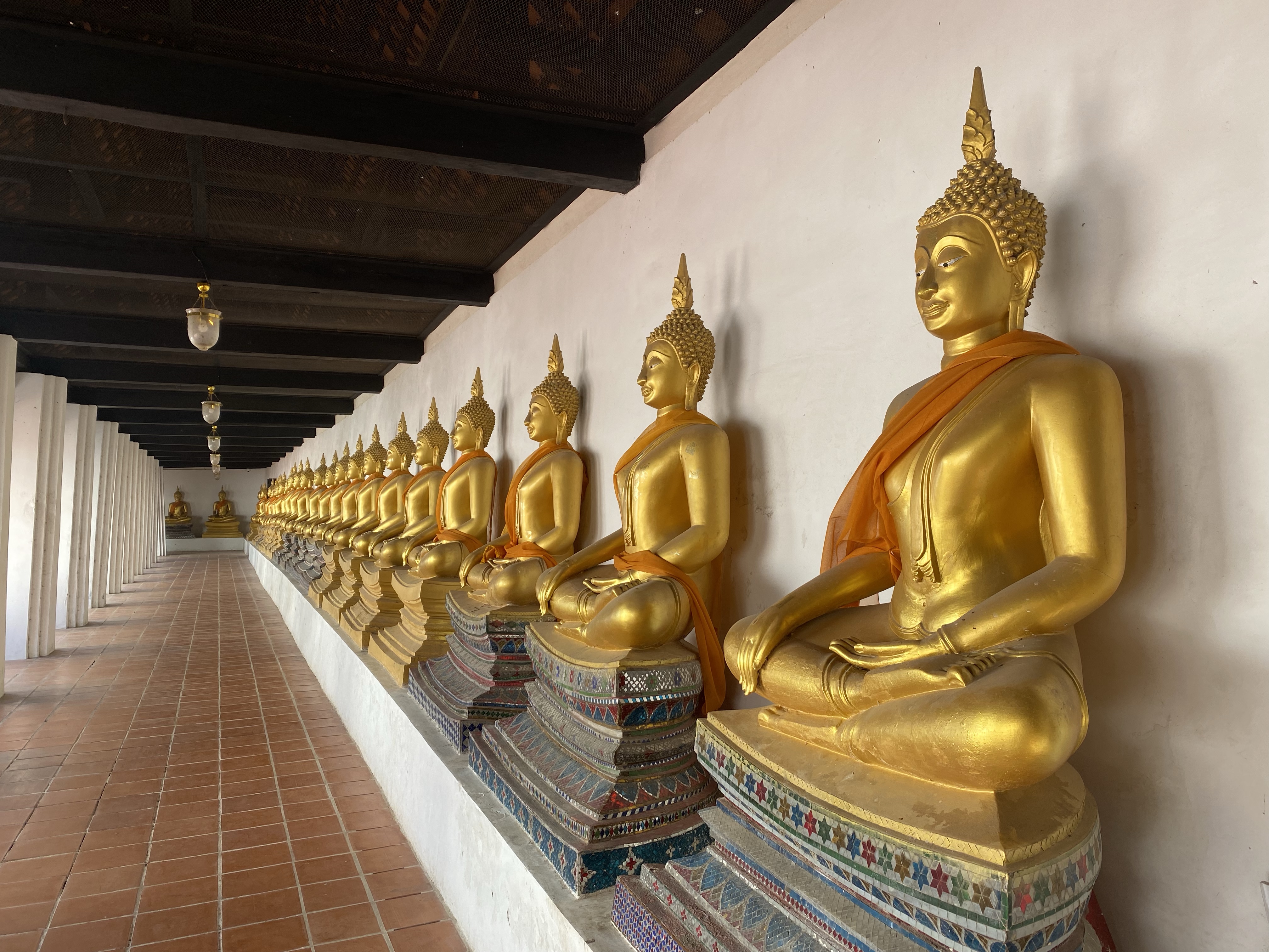 Our second stop also featured an amazing presentation of Golden Buddhas. These were lined around the outer wall facing the main prang at Wat Phutthaisawan. CreeperKitty estimated it was 128 Buddhas to go all the way around.