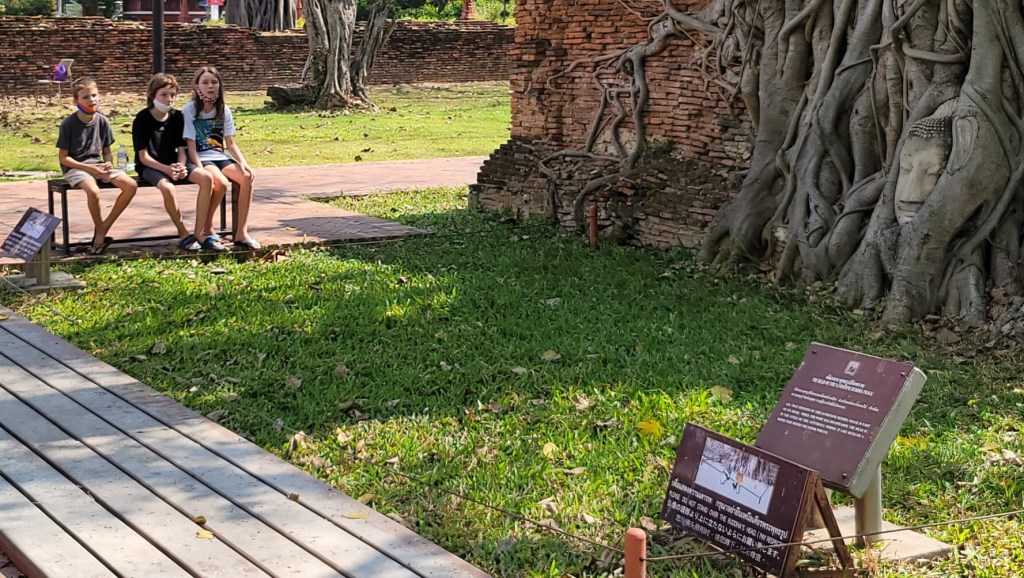 The precise circumstances of the stone head getting entwined in a tree isn’t known but it’s a well visited (and frequently photographed) part of an ancient wat which the Burmese burned to destruction in the 18th century.
