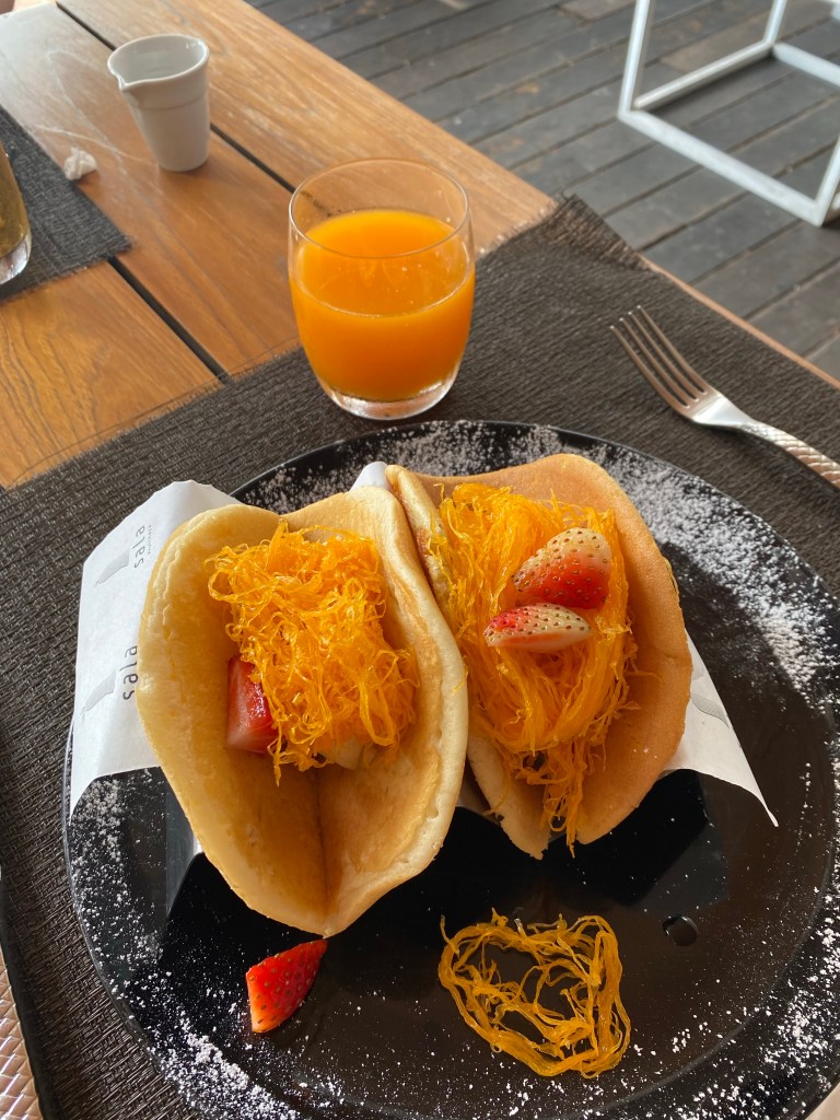 It had a lovely view of the Chao Phraya River and the Wat Phutthaisawan which we visited later in the day. They had pancakes on the menu which were presented like this.