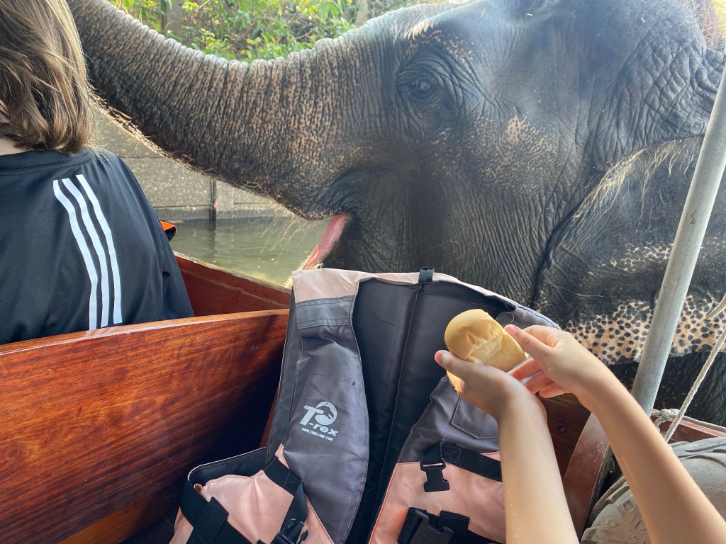 Our boat ride ended with a drive-by feeding of a river-friendly elephant.