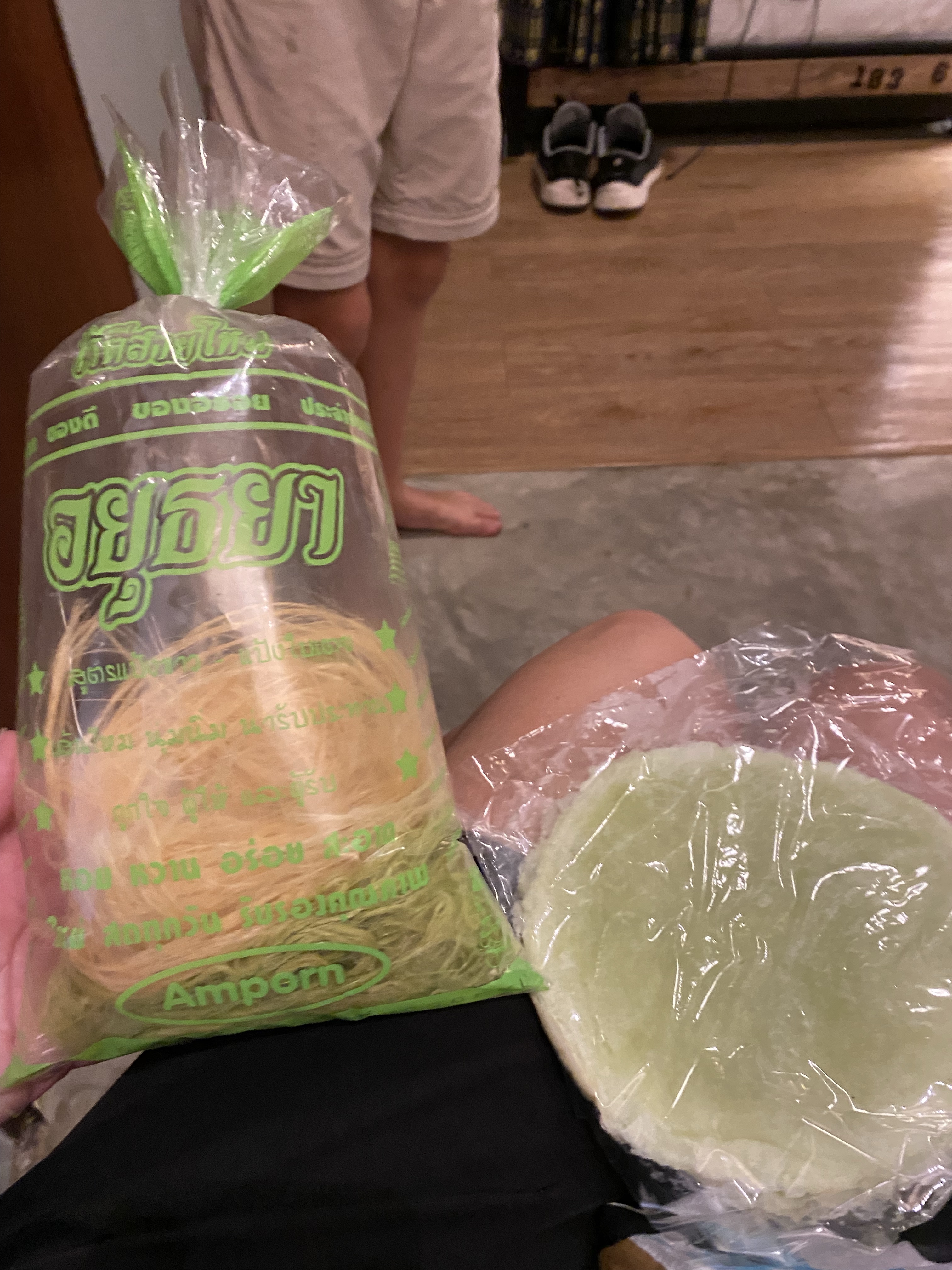 We bought some thinking they’d assemble it there, but instead we received it packed to go. We waited to eat it until we got back to our hotel and on the 15 minute walk passed at least 20 food stalls selling this treat – apparently we’re staying in the hot area for Roti Sai Mai. When we got back, we checked out what we got. On the right is the roti – there were about 10 individual crepes in there still warm from the store. On the left is the Thai Cotton Candy – notice the typical air-filled bag to keep it from getting squished.